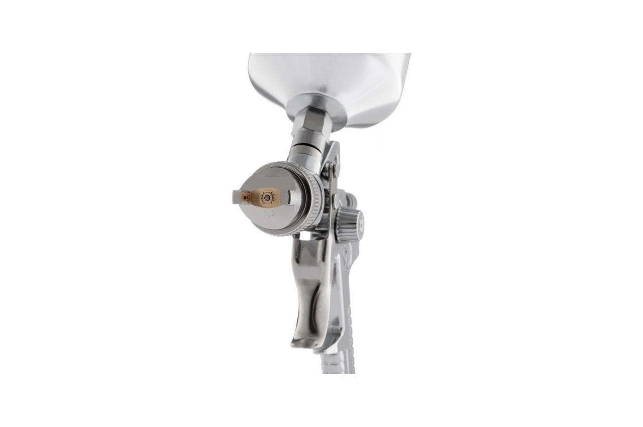 Діаметр форсунки - 1,3 мм. Обсяг металевого бачка з верхнім розташуванням становить 1000 мл. Показник витрати повітря при робочому тиску від 3,5 до 5 атм коливається в межах 200-300 л / хв. Розпилення може здійснюватися овальним або плоским факелом. Робочий тиск: до 3 атм; Діаметр форсунки: 1.3 мм; Витрата повітря: 230-300 л / хв; Розташування бачка: верхнє; Обсяг бачка 1000 мл; Матеріал бачка: метал; Діаметр шланга: 6-8 мм