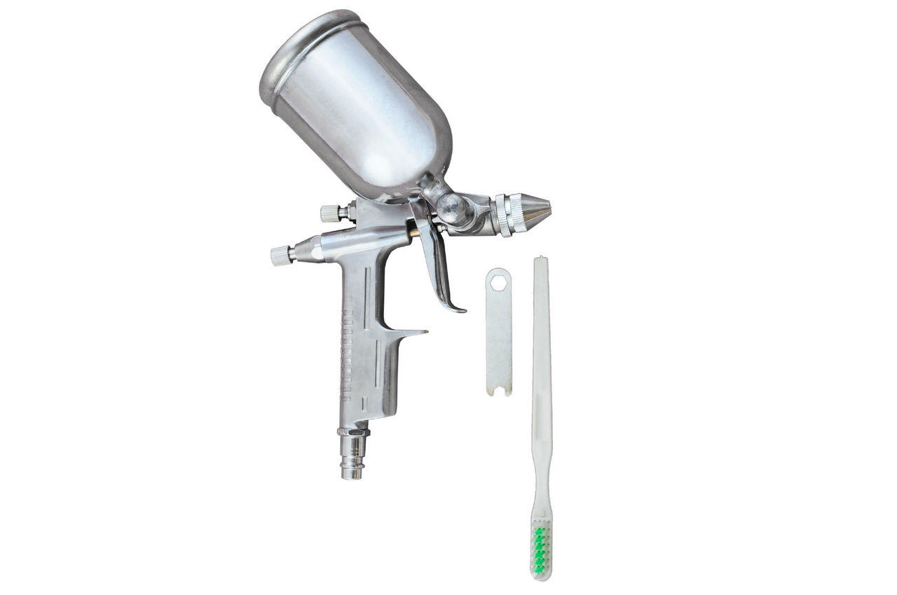 Пневматичний фарборозпилювач відмінно зарекомендував себе як бюджетну модель для проведення фарбувальних, тоніровочних і лакувальних робіт на невеликих, по площі, поверхнях. Він сконструйований за технологією НР (High Pressure), що має на увазі під собою використання високого тиску з відносно низькою витратою повітря. Краскопульт оснащений металевим бачком місткістю 200 мл, верхнім розташуванням і можливістю регулювання кута нахилу на 360 °. Дана модель дуже економічна. При робочому тиску до 5 атм, витрата повітря не перевищує 130 л / хв. Форсунка діаметром 0,5 мм забезпечує рівномірне нанесення ЛФМ овальним факелом. Робочий тиск: до 5 атм; Витрата повітря: до 130 л / хв; Діаметр форсунки: 0.5 мм; Діаметр шланга: 6-8 мм; Обсяг бачка: 200 мл; Розташування бачка: верхнє; Матеріал бачка: метал