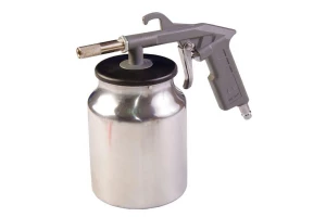 Пістолет піскоструминний використовують для абразивного зачищення поверхонь від старих лакофарбових покриттів, іржі та інших забруднень, а також для форміровкі поверхонь. Очищення проводиться за допомогою струменя стиснутого повітря і абразивного матеріалу (кварцового піску або спеціальної абразивної суміші). При роботі не варто забувати про засоби захисту: масці, рукавичках і окулярах. У комплекті дві форсунки: метал, кераміка. Витрата повітря: 320-400 л / хв; Діаметр форсунки: 6 мм; Обсяг бачка 1000 мл; Робочий тиск: 4-8 атм