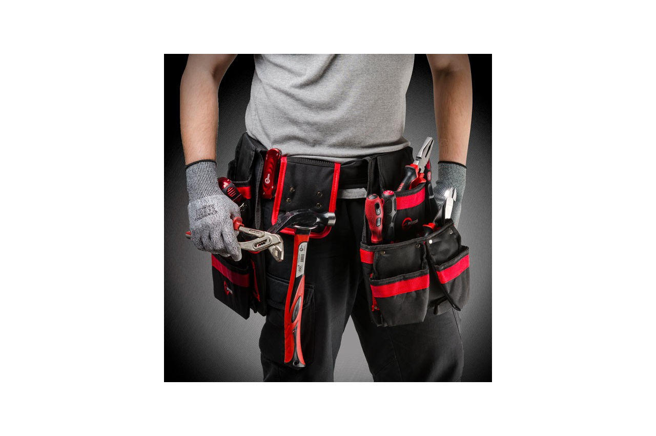 Має додатково посилені металевими заклепками кишені. Також є можливість регулювання довжини пояса. Всі кишені мають різні розміри, що дозволяє розмістити в них різноманітний будівельний інструмент. Має додатковий тримач під молоток або сокиру. Матеріал - поліестер. Кількість кишень: 18