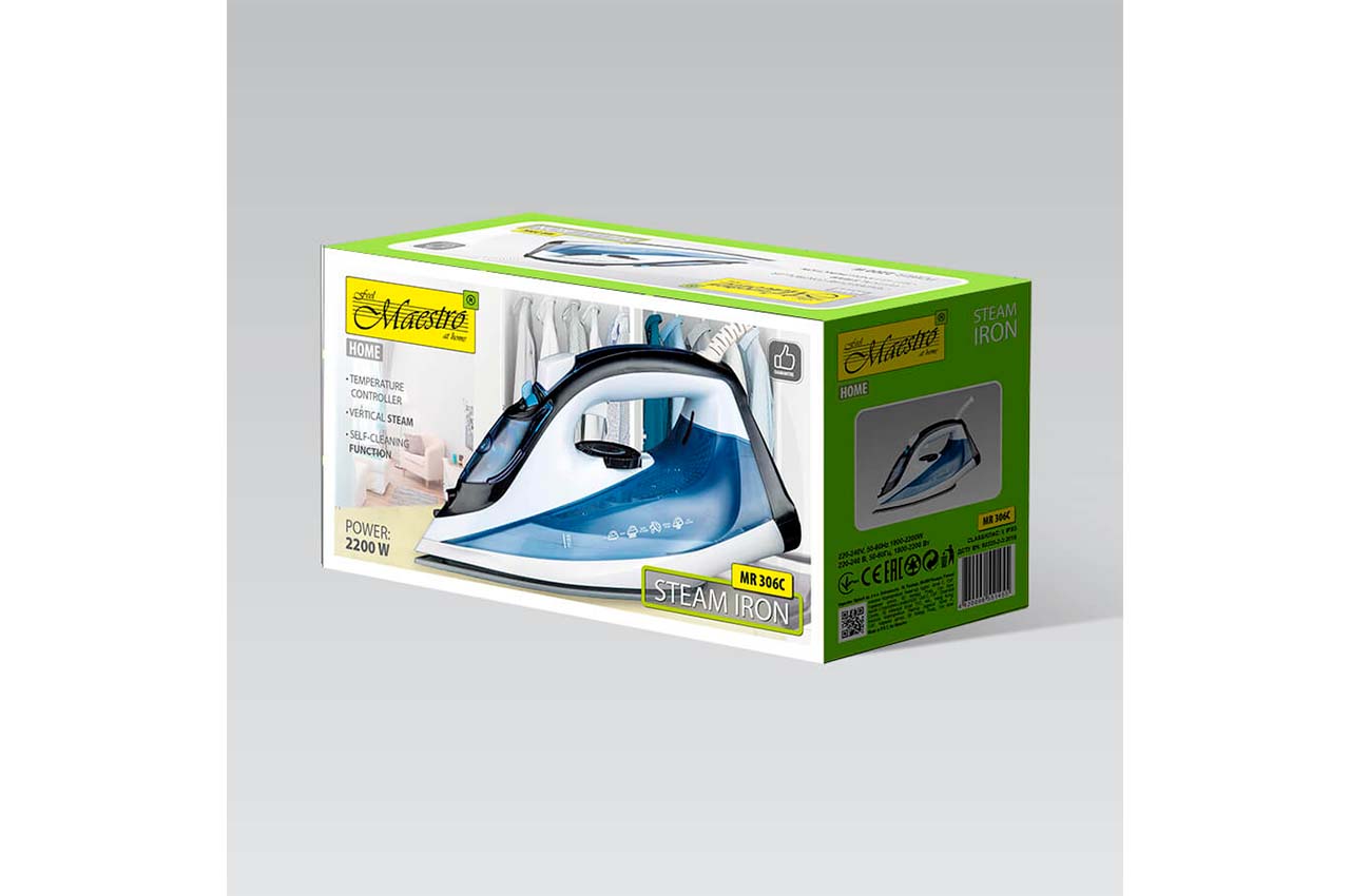 Праска Maestro MR-306 C має міцну та стійку до подряпин підошву з керамічним покриттям. Це рішення дозволяє гладити, не турбуючись про гудзики та блискавки, і забезпечує плавне ковзання праски по випрасуваних матеріалах, що знижує ризик опіків. Режими роботи: - Функція сухого або вологого прасування. - Додаткові можливості: паровий удар – забезпечує одноразове сильне упорскування пари; вертикальне прасування.