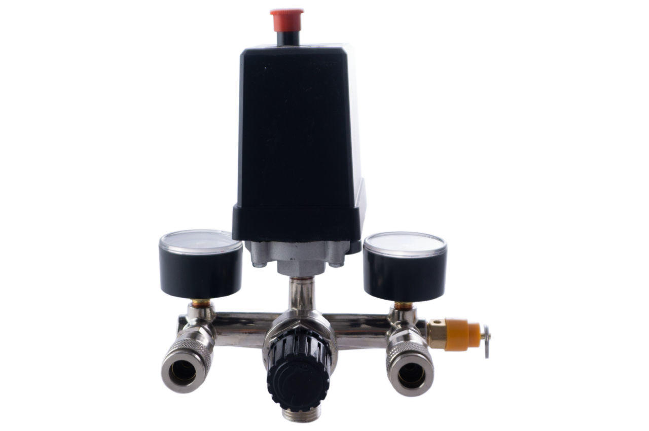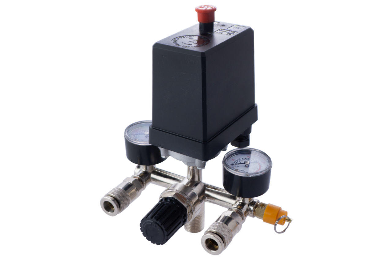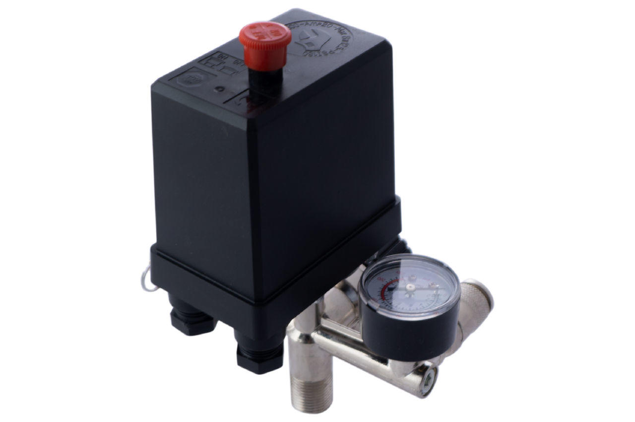 Прессостат у збиранні або реле тиску (блок управління), призначений для контролю тиску в ресивері компресора за заданими параметрами в автоматичному режимі. Використовується для трифазних повітряних поршневих компресорів з напругою 380В і максимальною потужністю до 3 кВт. Блок автоматики дозволяє здійснювати пуск та зупинку компресора у міру витрати повітря споживачем. Корпус пристрою виконаний з якісного пластику з надійною кнопкою, а мембранно-пружинний механізм забезпечує стабільну та безперебійну роботу: замикає та розмикає ланцюг живлення електродвигуна в залежності від робочого тиску. Контрольно-розподільний блок виготовлений із металу з високоточними манометрами. Для позаштатних ситуацій встановлено запобіжний клапан, який відкривається, якщо раптом тиск у ресивері досяг 10,5 атм. Запобіжний клапан виступає як додатковий захист, випускаючи з ресивера зайве стиснене повітря.