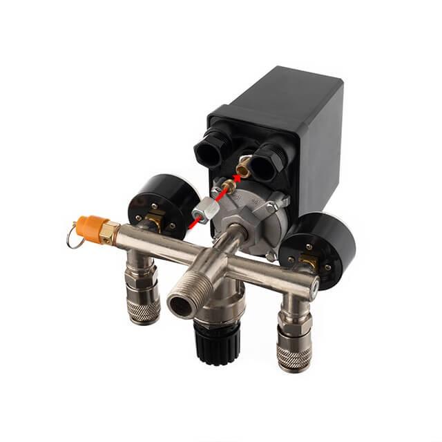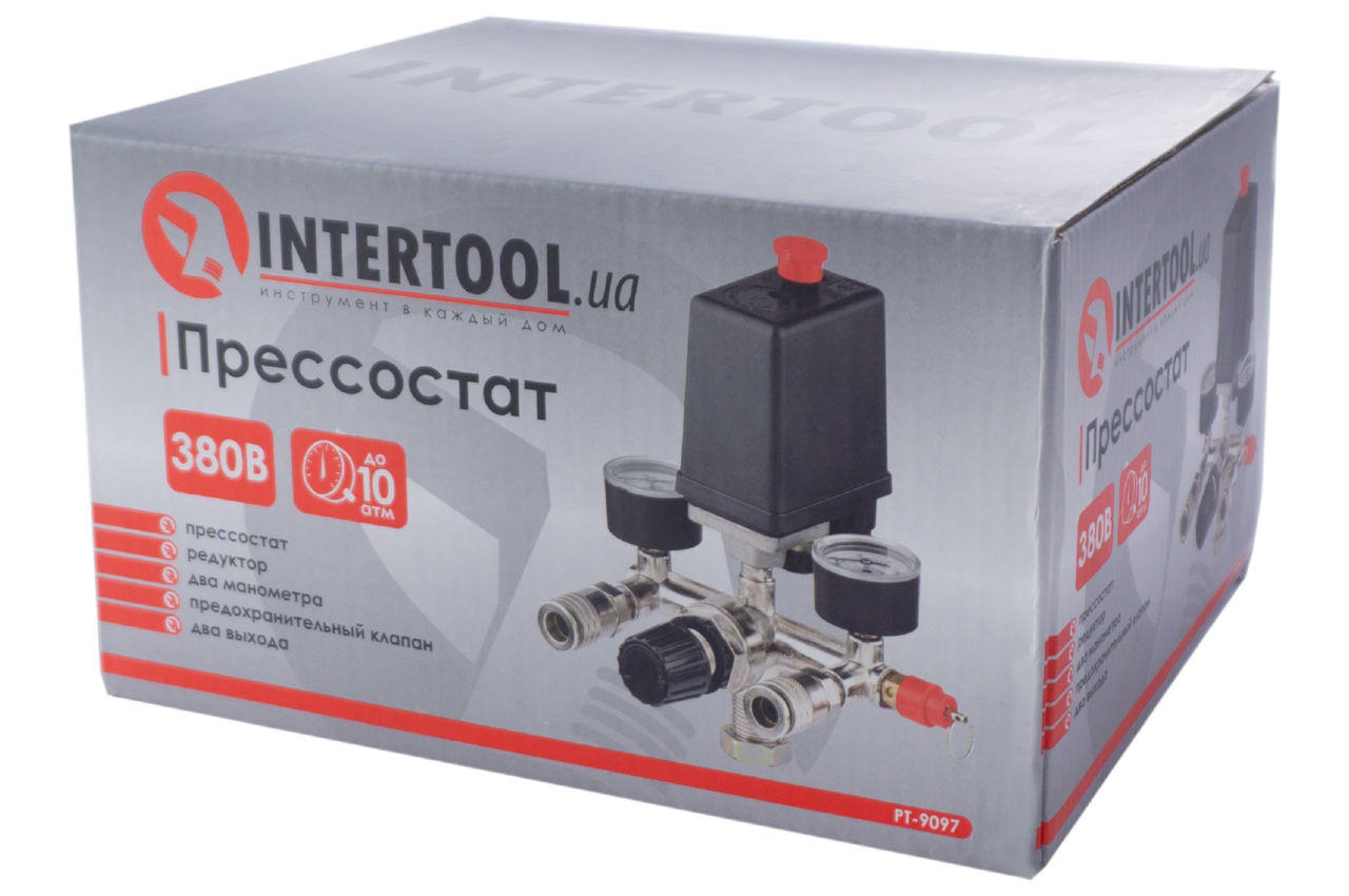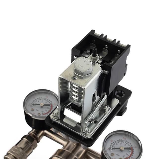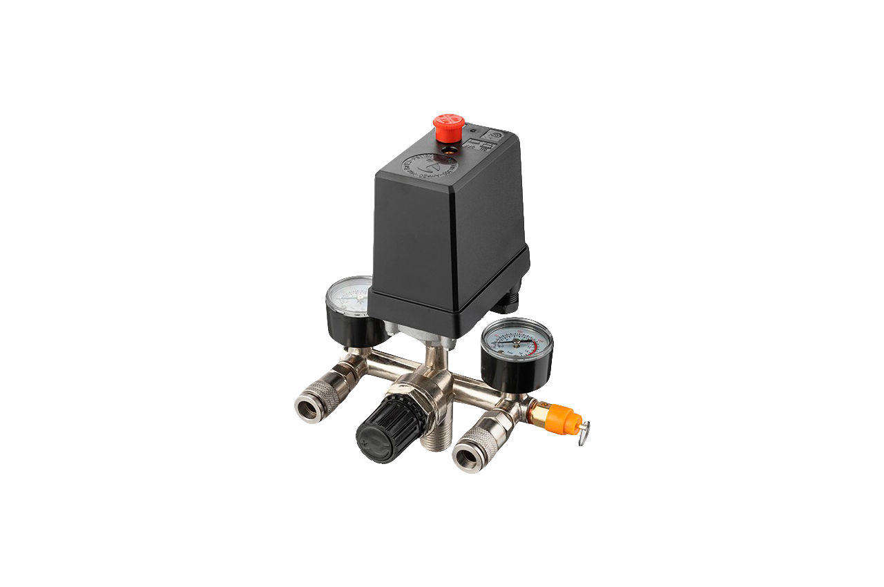 Прессостат у збиранні або реле тиску (блок управління), призначений для контролю тиску в ресивері компресора за заданими параметрами в автоматичному режимі. Використовується для трифазних повітряних поршневих компресорів з напругою 380В і максимальною потужністю до 3 кВт. Блок автоматики дозволяє здійснювати пуск та зупинку компресора у міру витрати повітря споживачем. Корпус пристрою виконаний з якісного пластику з надійною кнопкою, а мембранно-пружинний механізм забезпечує стабільну та безперебійну роботу: замикає та розмикає ланцюг живлення електродвигуна в залежності від робочого тиску. Контрольно-розподільний блок виготовлений із металу з високоточними манометрами. Для позаштатних ситуацій встановлено запобіжний клапан, який відкривається, якщо раптом тиск у ресивері досяг 10,5 атм. Запобіжний клапан виступає як додатковий захист, випускаючи з ресивера зайве стиснене повітря.