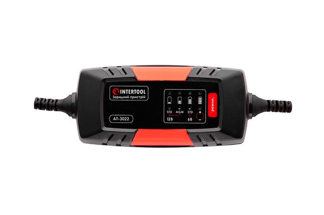 Зарядний пристрій INTERTOOL AT-3022 - інтелектуальний, керується мікропроцесором та системою з багатоступеневим циклом заряджання. Пристрій підходить для всіх типів батарей: 6 В мотоциклів, 12 В автомобілів, а також для акумуляторів катерів, газонокосарок, гідроциклів, сільськогосподарської техніки, промислового та побутового обладнання. Зарядний пристрій має повністю ізольовані клеми та компактні габарити, не займає багато місця в гаражі чи авто. Індикація на панелі керування показує напругу батареї та процес заряджання.