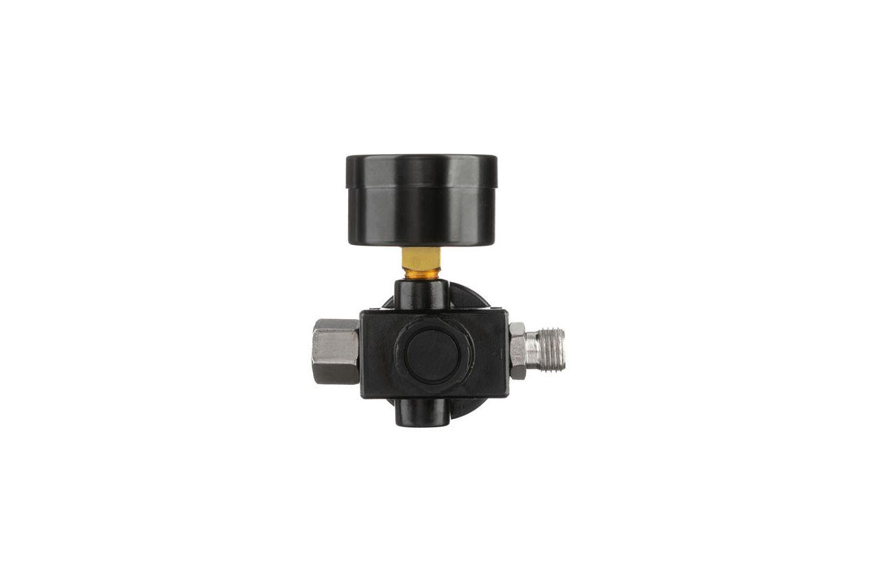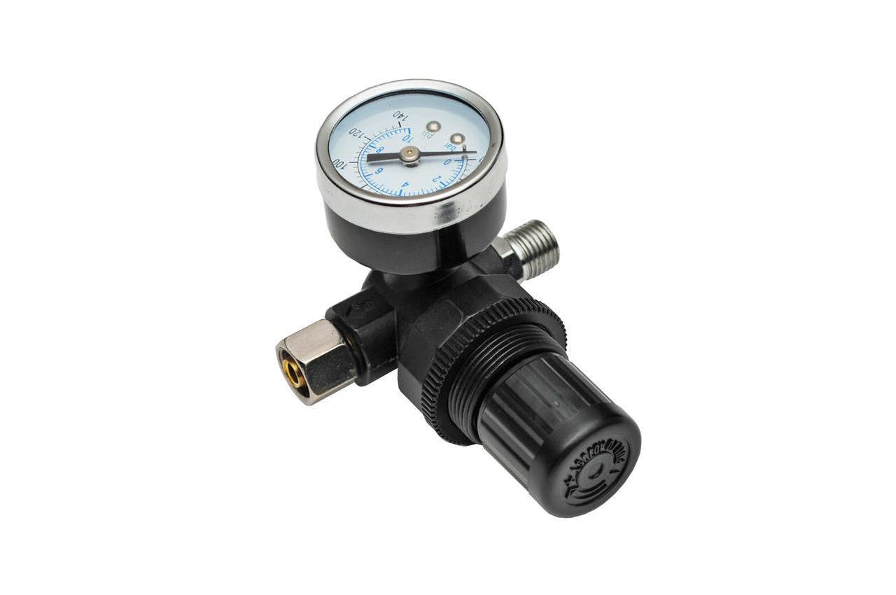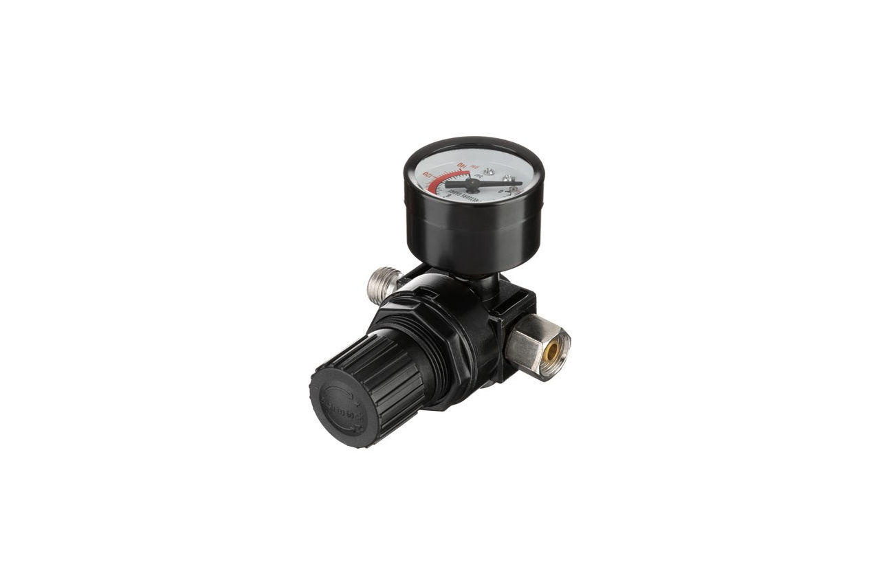 Регулятор тиску повітря з манометром - невеликої ваги, Ваша рука не втомлюється при тривалій роботі. Система швидкого монтажу до фарбувального пістолета гарантує зручне сполучення з пневмоінструментом. Регулятор тиску дозволяє швидко налаштувати роботу фарбопульта. Повітря подається з боку із зовнішнім різьбленням 1/4 ", вихід повітря - з боку внутрішньої різьби 1/4". Монтується безпосередньо на фарбувальний пістолет. Перехідники не включені в комплектацію. Діаметр шланга: 6-8 мм; Діаметр різьби: 1/4 "