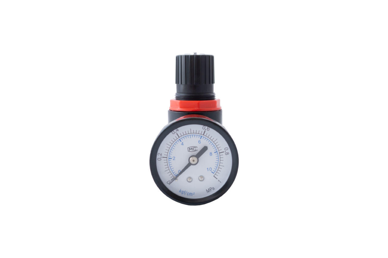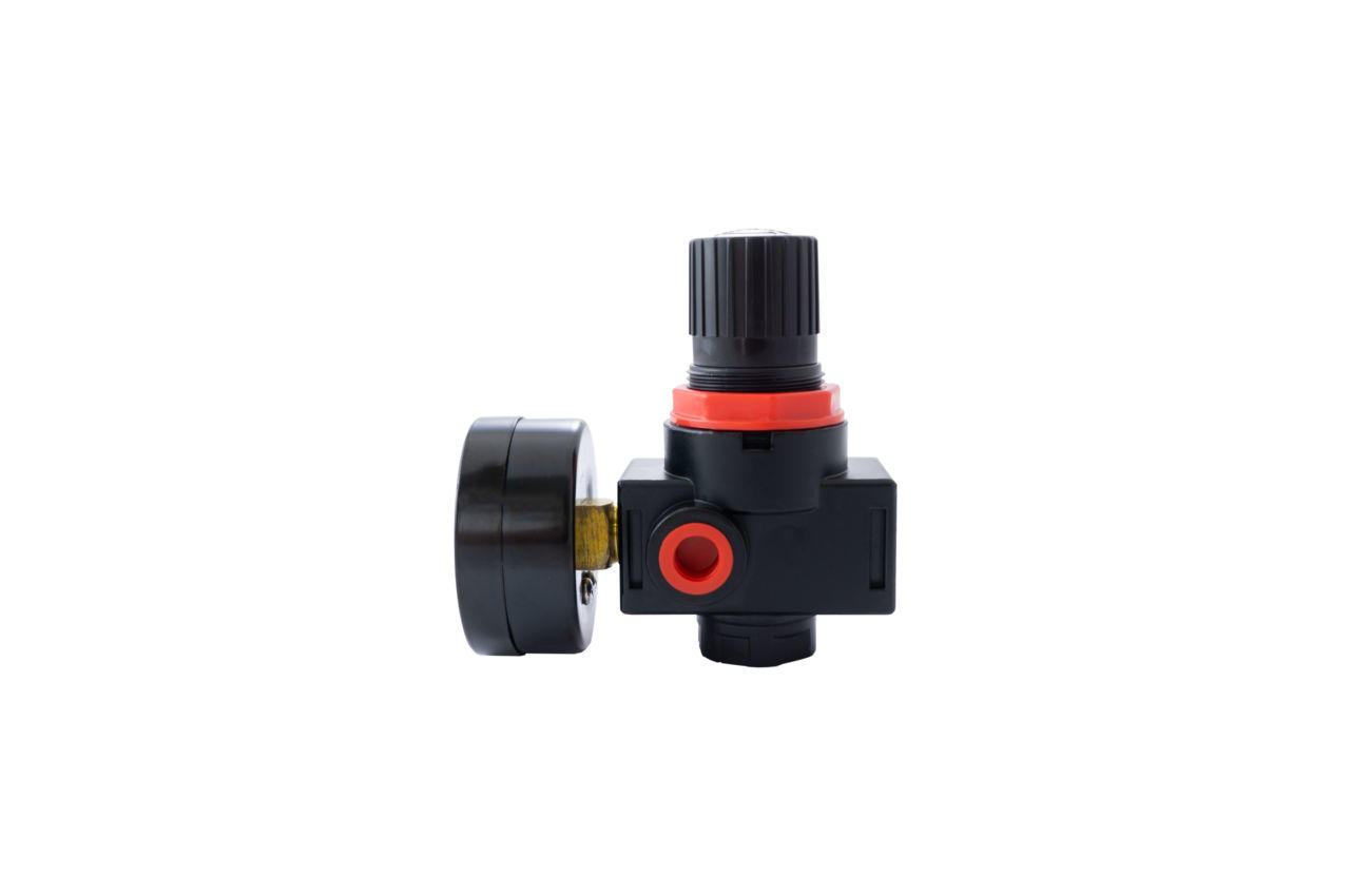 Компактний регулятор з пропускною спроможністю до 850 л / хв. Легко встановлюється на вертикальні поверхні. Кріплення в комплекті. Регулятор має замок-фіксатор. Для регулювання тиску необхідно підняти регулятор вгору, для фіксації - опустити вниз до клацання. Комплектується високоточним манометром з металевим корпусом. Різьблення: 1/4 "; Робочий тиск: 0,5-8 бар; Максимальний тиск: 10 бар