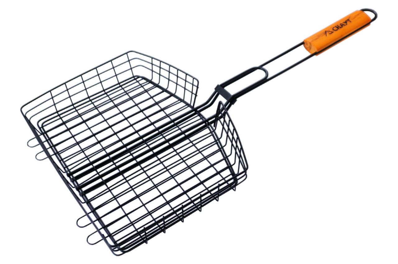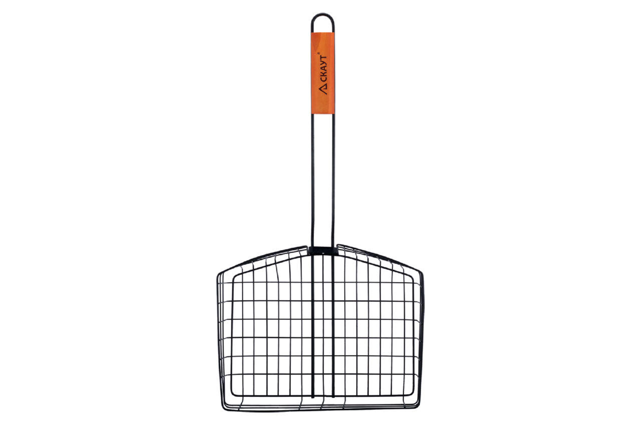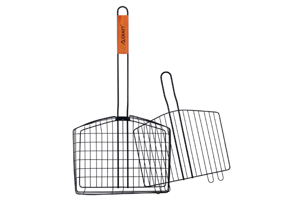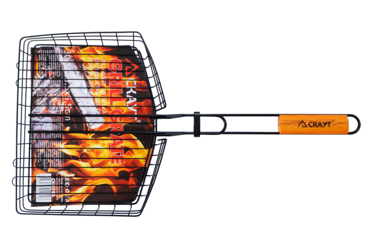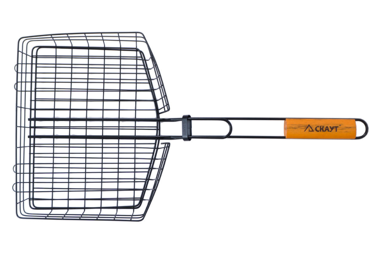 Решітка-гриль Скаут - 305 x 235 x 55 мм антипригарна можна легко і швидко приготувати м'ясні стейки, рибу та овочі на мангалі. Завдяки антипригарному покриттю продукти не пригорають до ґрат. Зручна ручка із дерев'яною вставкою не нагрівається. Завдяки надійній фіксації та притиску продукти прожарюються рівномірно, а цікава форма переплетення прутів надасть дуже апетитного вигляду готовій страві.