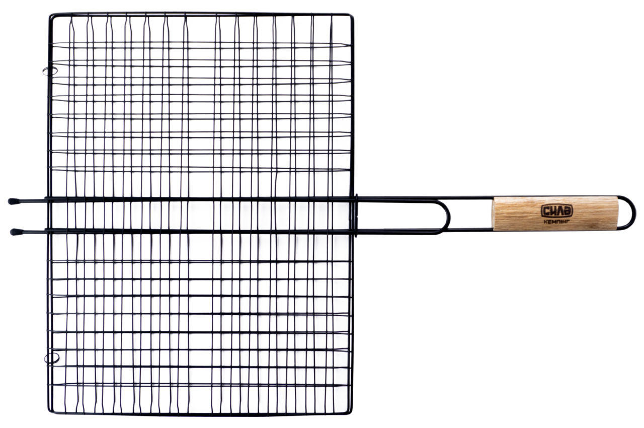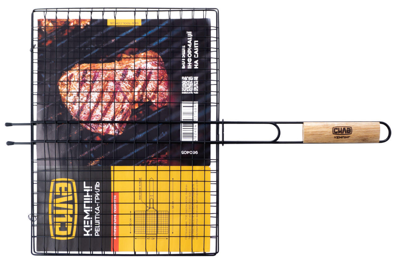 Решітка-гриль Сила - 400 x 300 мм антипригарная. Можна легко і швидко приготувати м'ясні стейки, рибу та овочі на мангалі. Завдяки антипригарному покриттю продукти не пригорають до ґрат. Зручна ручка із дерев'яною вставкою не нагрівається. Завдяки надійній фіксації та притиску продукти прожарюються рівномірно, а цікава форма переплетення прутів надасть дуже апетитного вигляду готовій страві.