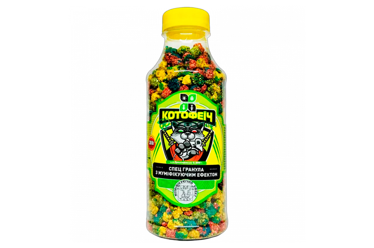 Ефективний родентицид Котофеїч у вигляді гранул об’ємом 300 г у пляшці. Призначений для знищення щурів та мишей у житлових, складських та господарських приміщеннях. Зручна упаковка дозволяє легко дозувати та зберігати препарат.