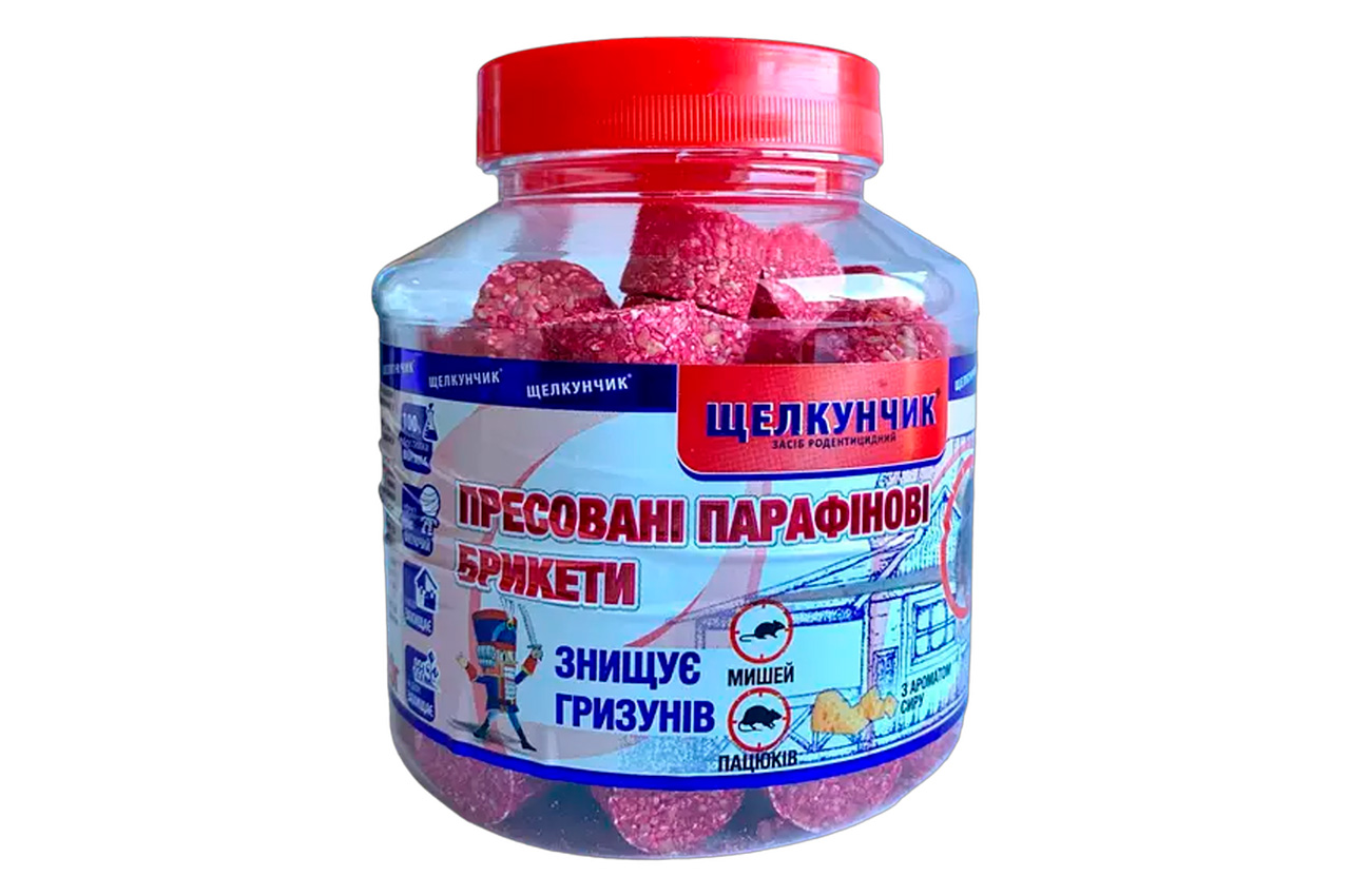 Ефективний родентицид Щелкунчик у вигляді парафінових брикетів, вагою 320 г, упакованих у пляшку. Призначений для знищення мишей і щурів у житлових, складських та господарських приміщеннях. Парафінова оболонка забезпечує тривале збереження активних компонентів та зручне використання.