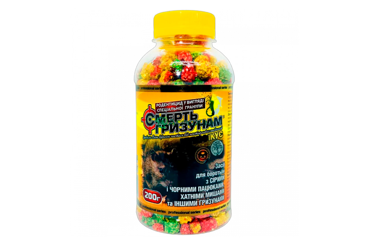 Ефективний родентицид Смерть Гризунам у вигляді гранул об’ємом 200 г у пляшці. Призначений для знищення щурів та мишей у житлових, складських та господарських приміщеннях. Зручна упаковка дозволяє легко дозувати та зберігати препарат.