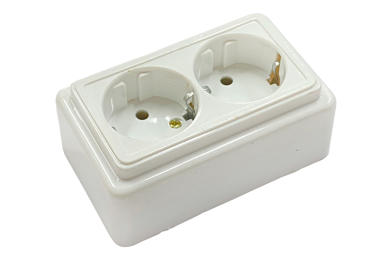 Розетка біла,подвійна накладна - 105×65×45мм із заземленням