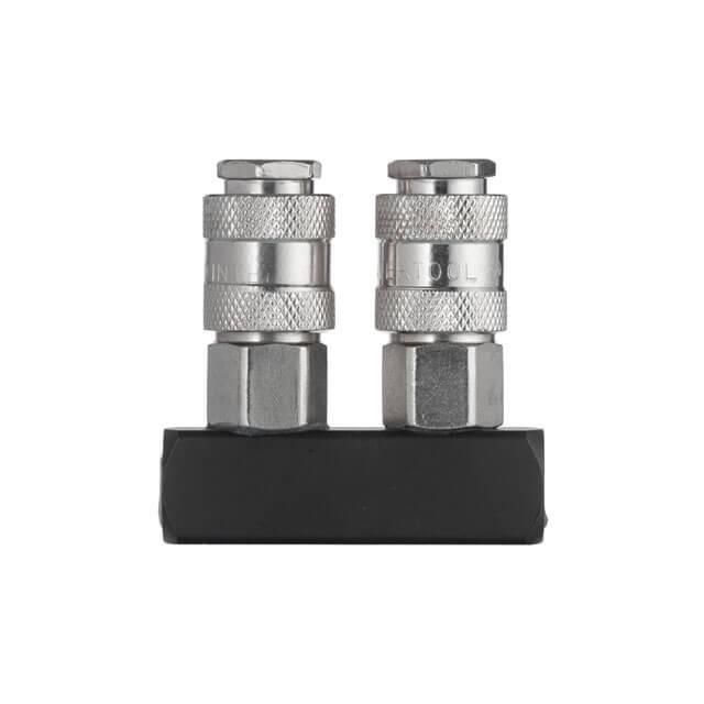 Прямий перехідник повітря дозволяє одночасно підключити 2 споживача повітря і побудувати потужну пневматичну систему з тиском до 10 бар. На вході повітря встановлена різьблення 1/4 ", а на виходах надійні універсальні швидкороз'ємні з'єднання, які дозволяють легко підключити шланги високого тиску з пневмоінструментом. Особливості Зручне підключення великої кількості споживачів в повітряну магістраль Проста і надійна ударопрочная конструкція Сполуки швидко універсальні під різні регіональні типи конекторів . Муфта бистрораз'емов оснащена сердечником з латуні, що в рази збільшує термін служби з'єднувача і забезпечує повну герметичність навіть при сильному зносі.