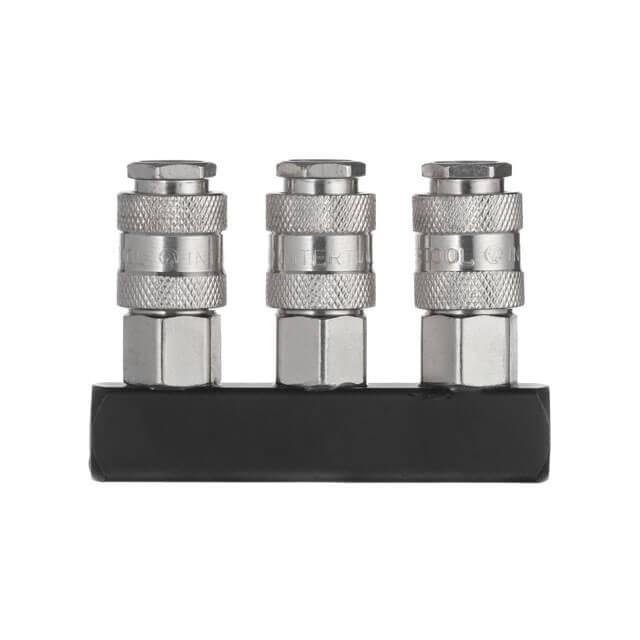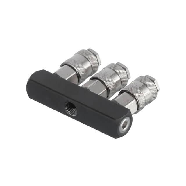 Прямий перехідник повітря дозволяє одночасно підключити 3 споживача повітря і побудувати потужну пневматичну систему з тиском до 10 бар. На вході повітря встановлена різьблення 1/4 ", а на виходах надійні універсальні швидкороз'ємні з'єднання, які дозволяють легко підключити шланги високого тиску з пневмоінструментом. Особливості Зручне підключення великої кількості споживачів в повітряну магістраль Проста і надійна ударопрочная конструкція Сполуки швидко універсальні під різні регіональні типи конекторів . Муфта бистрораз'емов оснащена сердечником з латуні, що в рази збільшує термін служби з'єднувача і забезпечує повну герметичність навіть при сильному зносі