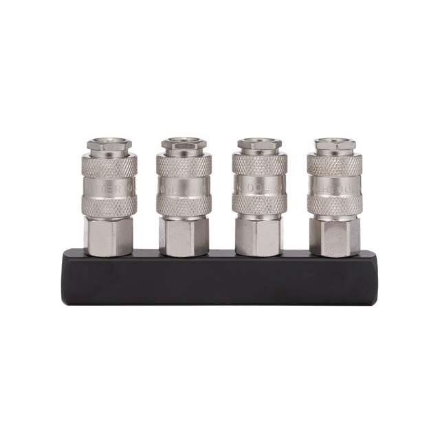 Прямий перехідник повітря дозволяє одночасно підключити 4 споживача повітря і побудувати потужну пневматичну систему з тиском до 10 бар. На вході повітря встановлена різьблення 1/4 ", а на виходах надійні універсальні швидкороз'ємні з'єднання, які дозволяють легко підключити шланги високого тиску з пневмоінструментом. Особливості Зручне підключення великої кількості споживачів в повітряну магістраль Проста і надійна ударопрочная конструкція Сполуки швидко універсальні під різні регіональні типи конекторів . Муфта бистрораз'емов оснащена сердечником з латуні, що в рази збільшує термін служби з'єднувача і забезпечує повну герметичність навіть при сильному зносі