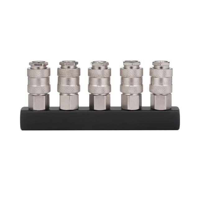 Прямий перехідник повітря дозволяє одночасно підключити 5 споживачів повітря і побудувати потужну пневматичну систему з тиском до 10 бар. На вході повітря встановлена різьблення 1/4 ", а на виходах надійні універсальні швидкороз'ємні з'єднання, які дозволяють легко підключити шланги високого тиску з пневмоінструментом. Особливості Зручне підключення великої кількості споживачів в повітряну магістраль Проста і надійна ударопрочная конструкція Сполуки швидко універсальні під різні регіональні типи конекторів . Муфта бистрораз'емов оснащена сердечником з латуні, що в рази збільшує термін служби з'єднувача і забезпечує повну герметичність навіть при сильному зносі