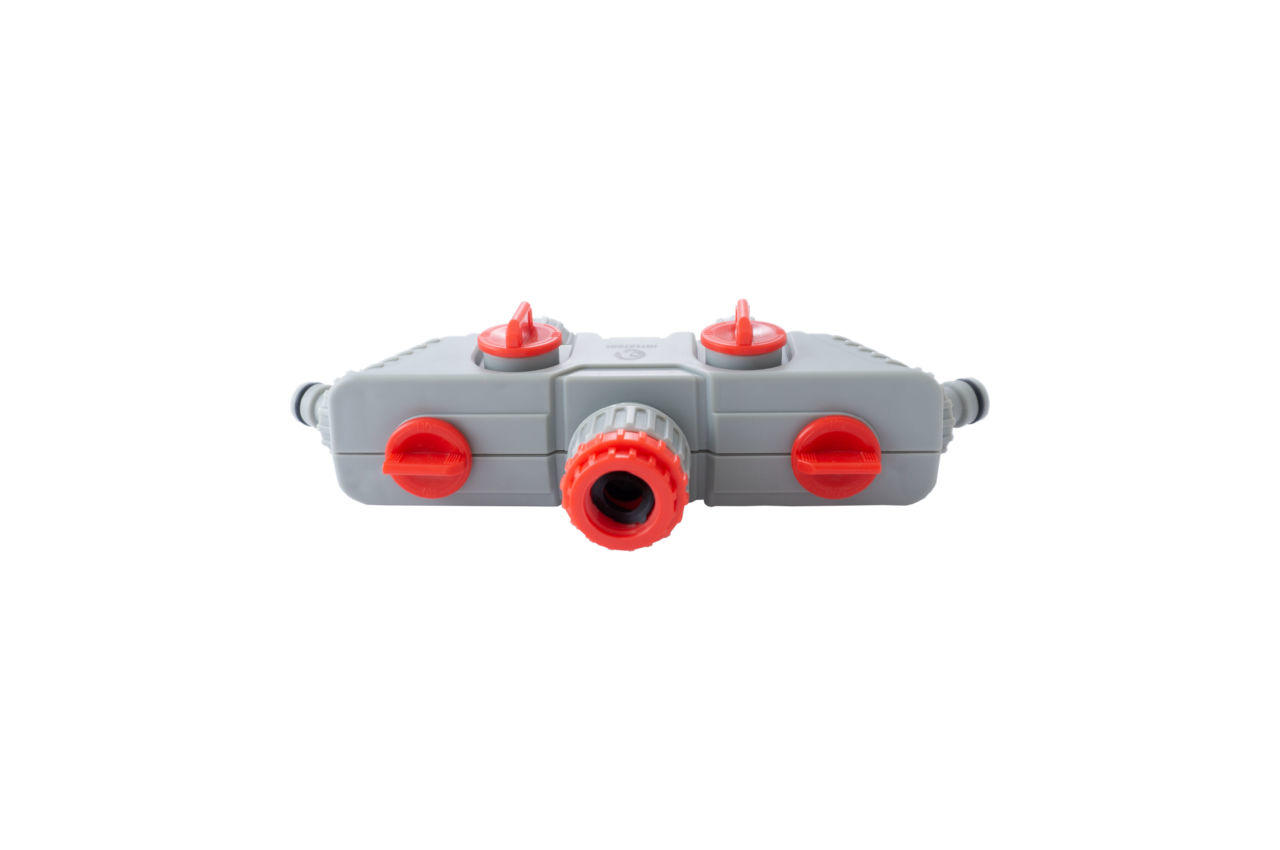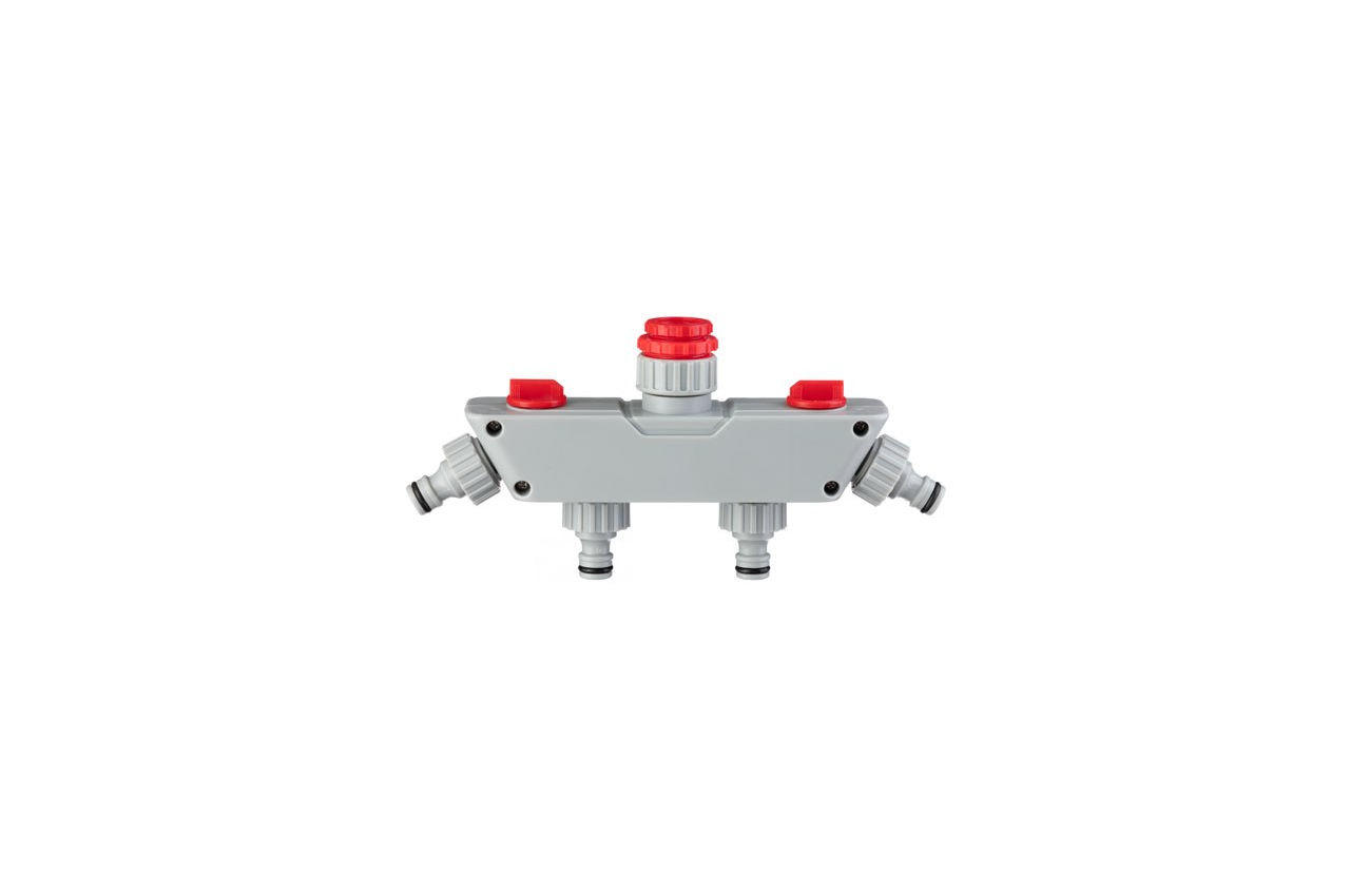 Розподільник 4-х канальний дозволяє одночасно підключати до чотирьох водяних шлангів до одного крану. Потік можна плавно регулювати в кожній лінії окремо, аж до повного перекриття подачі води. На вході води встановлені перехідники для підключення різних різьбових з'єднань, діаметрами: 1 ", 1/2", 3/4 ", що дуже зручно. Вихід під шланги з адаптерами 1/2 "дозволяють швидко і без особливих зусиль зібрати систему поливу з використанням конекторів для шланга. Ви також можете підключити різьбові з'єднання на виходи, оскільки адаптери знімні, і встановлені на зовнішню різьбу 3/4". Всі з'єднання ущільнені гумовими манжетами, що виключає витік води і забезпечує повну герметичність. Також на вході води встановлено фільтр грубої очистки для запобігання поломки і засмічення системи. На всіх каналах підключення передбачені рифлені насічки, для зручного користування навіть мокрими руками. Підключення: Внутрішня різьба на вході 1 ", 1/2", 3/4 ", на виходах адаптер під коннектор 1/2"; Особливості: Регулювання напору в кожному каналі