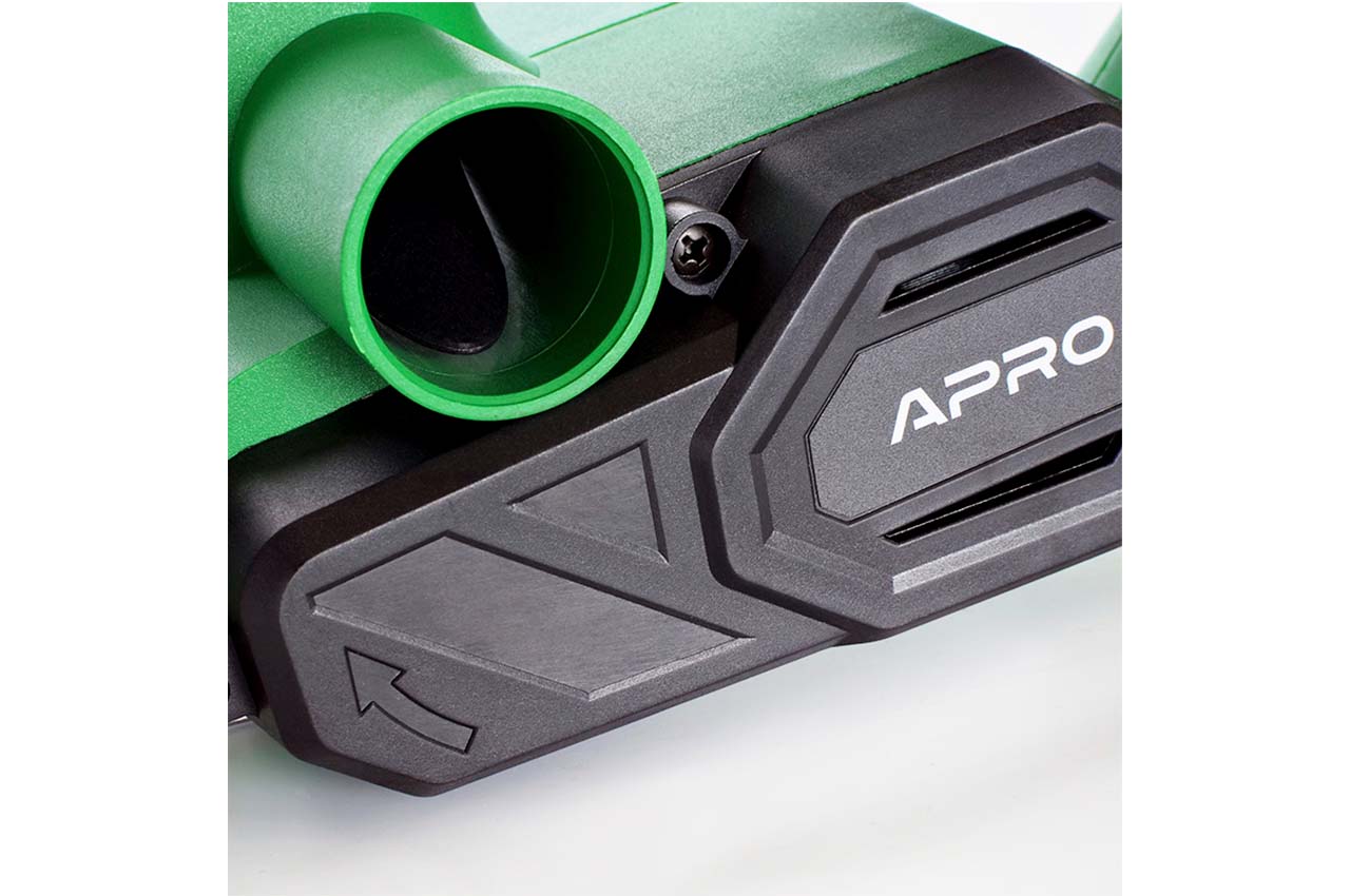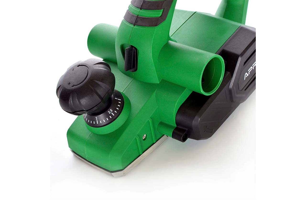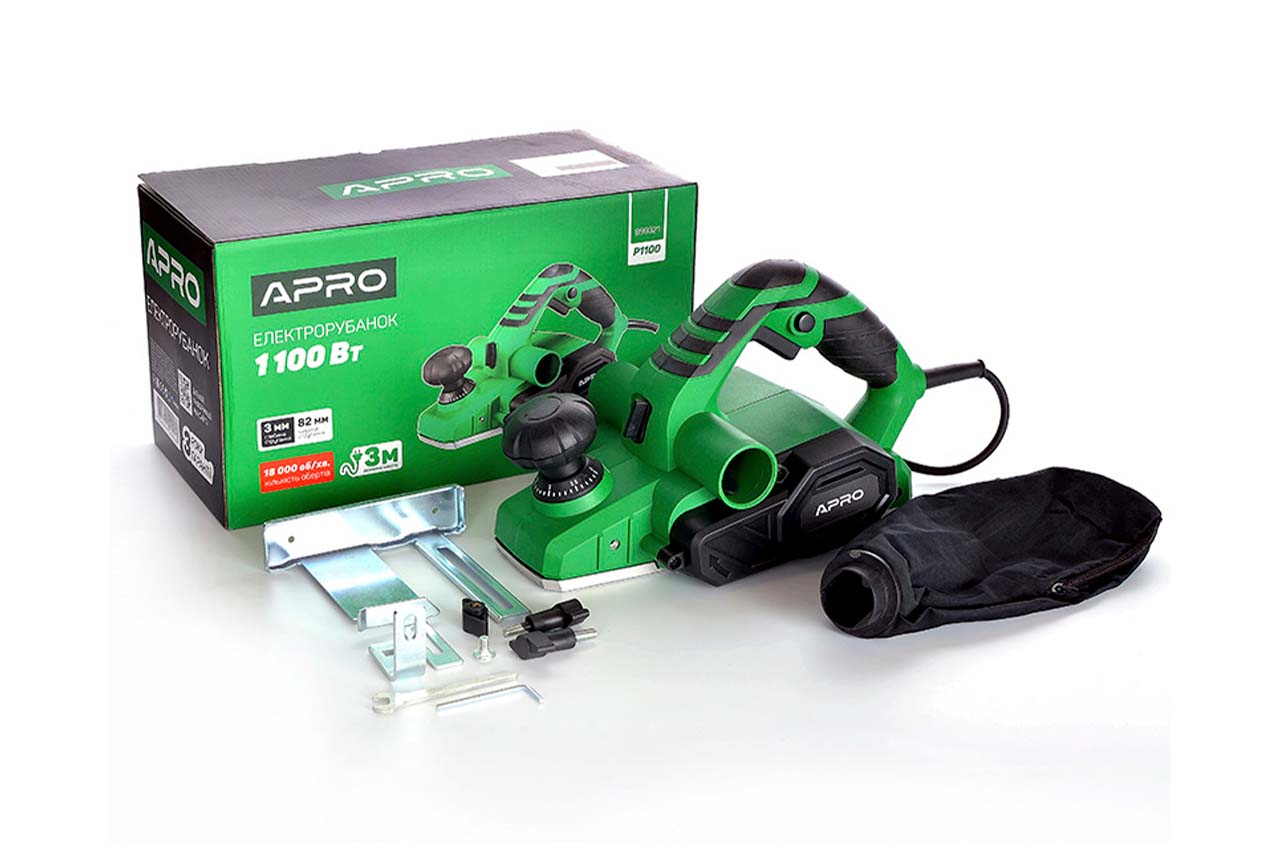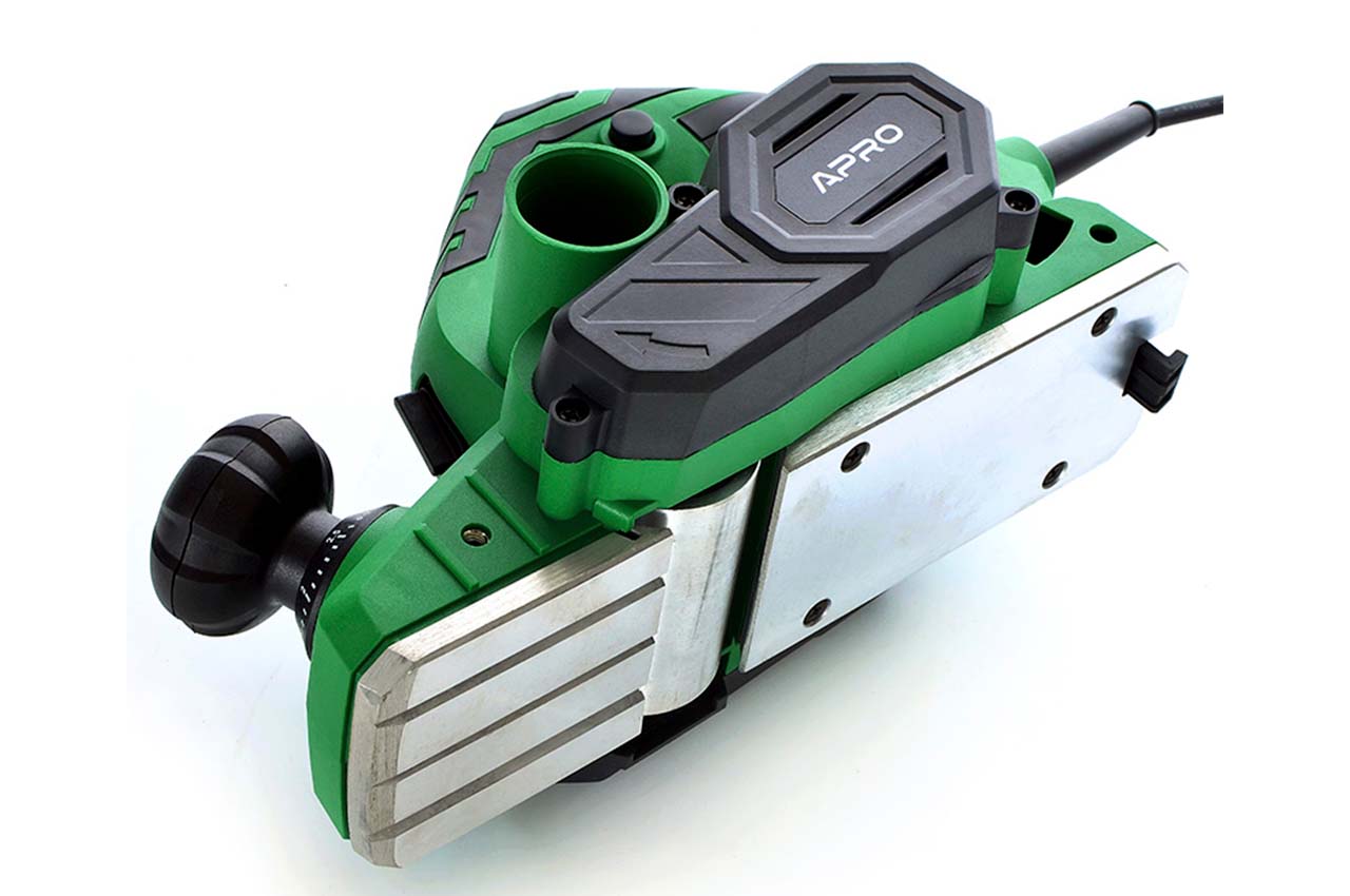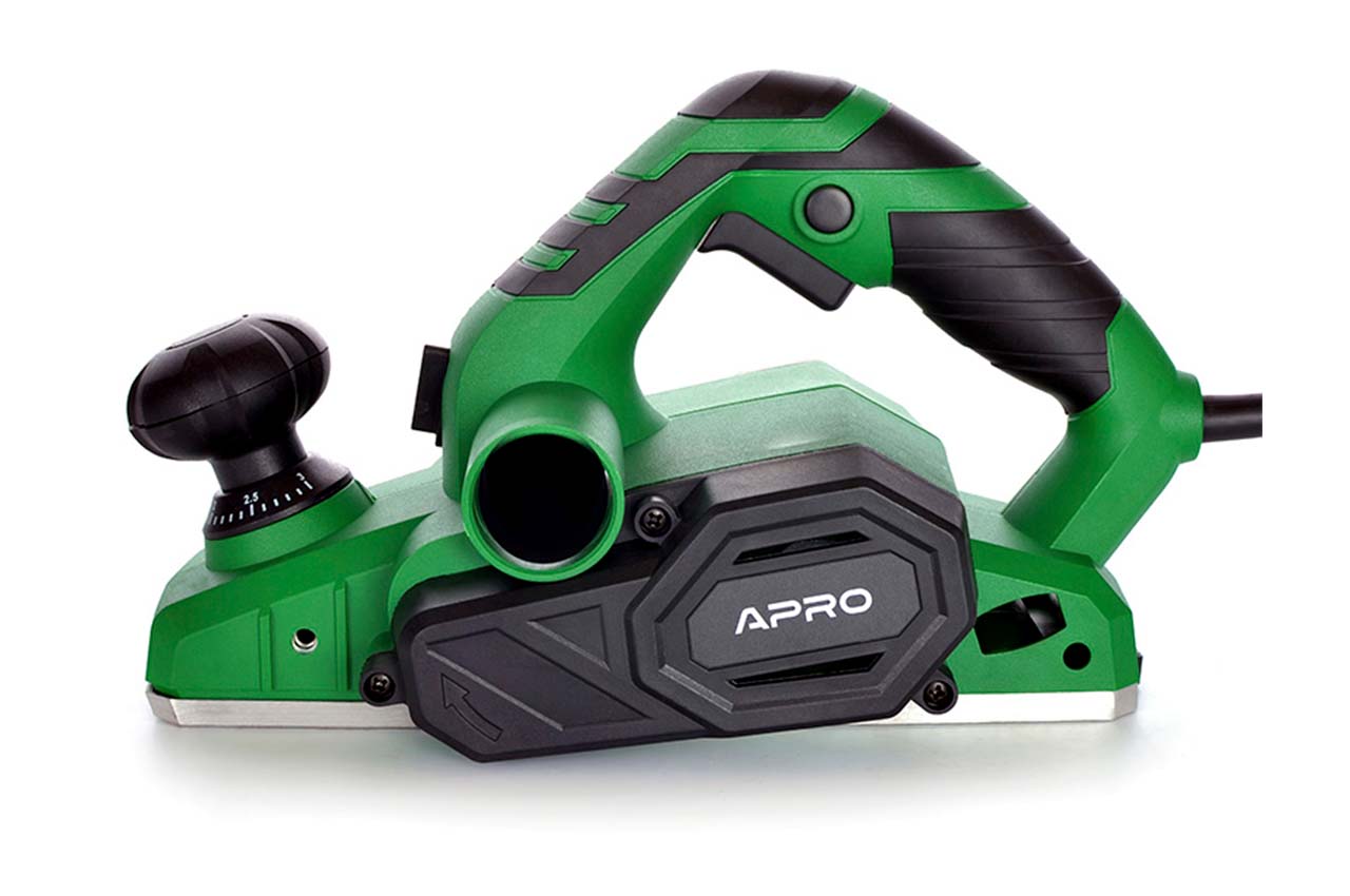 Рубанок електричний Apro - P1100 Професійний інструмент для обробки деревини. Застосовується в столярних роботах, з виробництва з дерев'яними конструкціями тощо. Завдяки потужності двигуна 1100 Вт, частота обертання барабана сягає 18000 об/хв. Двигун та зносостійкі робочі вузли надійні та продуктивні. Ріжучий ніж рубанка якісно знімає стружку шириною до 82мм, а максимальною глибиною в один прохід до 3мм. Глибина регулюється автоматично, залежно від завдання. Інструмент досить простий в обслуговуванні, характеризується довготривалою та продуктивною роботою.