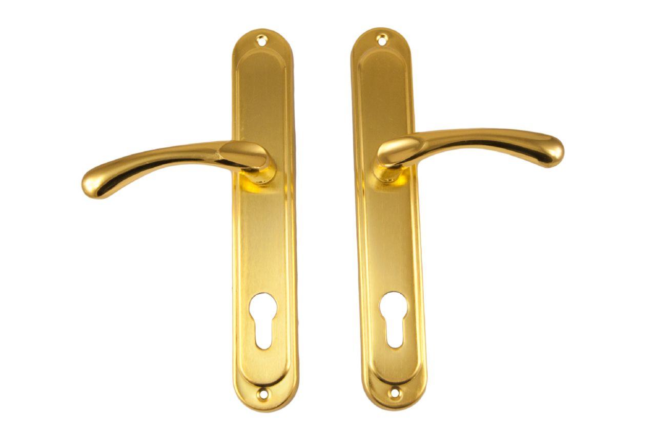 Міжкімнатна дверна ручка на планці з отвором під секрет. Призначена для установки на міжкімнатні двері та сумісна з замками під циліндр. Планка виготовлена з металу, ручка – з цинку, що забезпечує надійність, міцність і довговічність. Покриття GP додає естетичний вигляд і захищає від подряпин та корозії.
