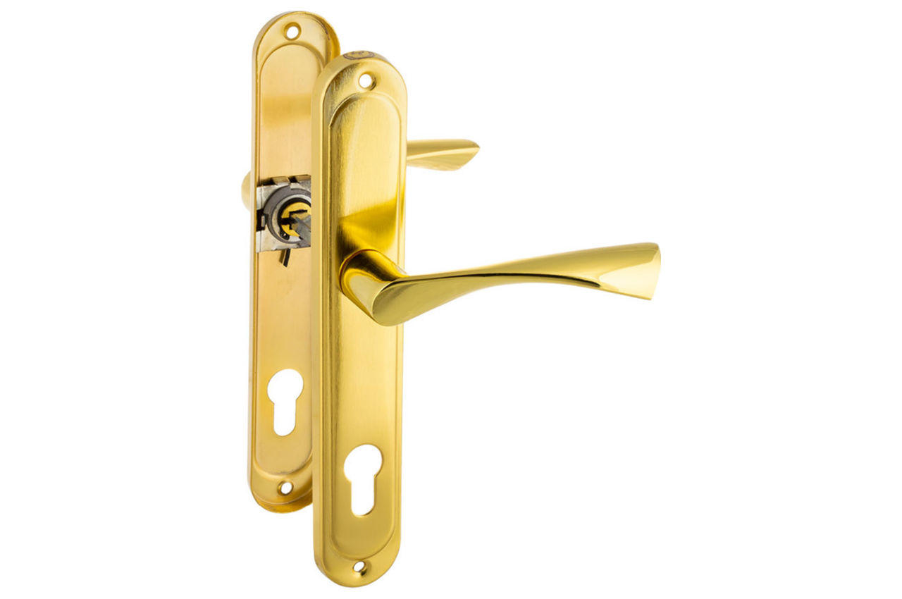 Модель FZB ET-257 GP має глянцеве золоте покриття, яке додає дверям розкішного вигляду. Ідеально підходить для класичних інтер’єрів. Міцна металева планка та ручка з цинку забезпечують надійність і тривалий термін служби. Відстань до циліндра: 85 мм