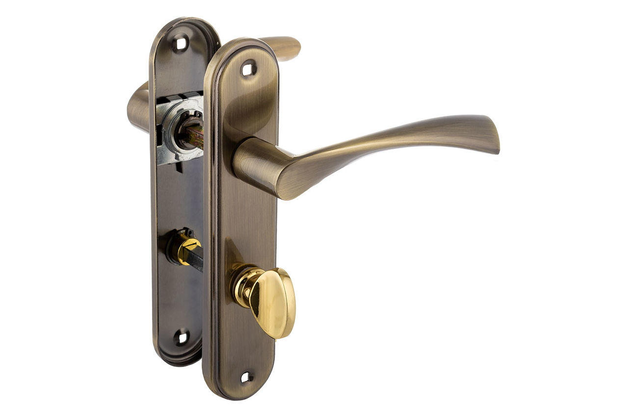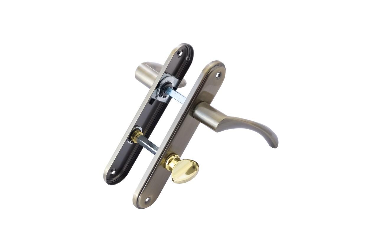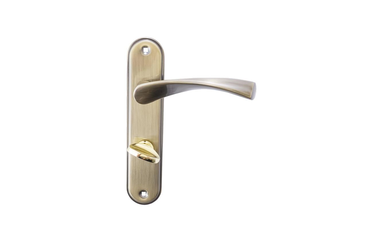 Дверна ручка FZB BK-71157 на планці з фіксатором — зручне та практичне рішення для міжкімнатних дверей у ванну кімнату, туалет або підсобні приміщення. Оснащена поворотним замикальним механізмом, що дозволяє швидко та легко зачиняти двері зсередини. Античне бронзове покриття (AB) надає ручці елегантного вигляду та робить її стійкою до зношення. Завдяки надійній конструкції з металу та ручці із цинкового сплаву, модель слугуватиме довго навіть при щоденному використанні. Сумісна з дверима товщиною 35–45 мм. Міжосьова відстань: 62 мм