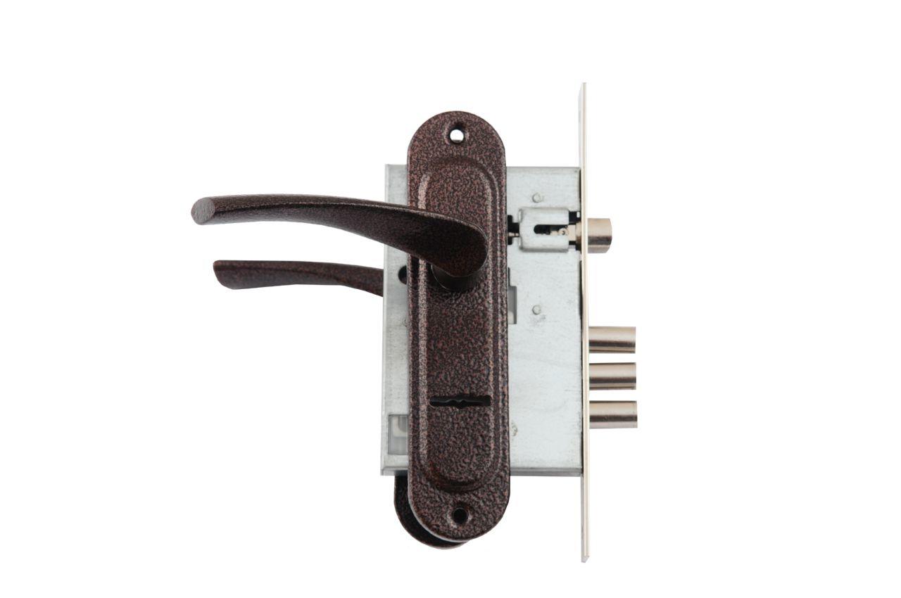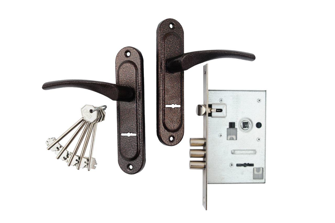 Ручка на планці з корпусом FZB – 55 мм ET-CY5555Y AC (антична мідь). Комплект фурнітури, що включає дверні ручки на планці, врізний замок та комплект ключів. Планка виготовлена з міцного металу, а ручка — з алюмінію, що гарантує міцність і комфортне користування. Покриття в кольорі антична мідь (AC) додає елегантності та надійно захищає поверхню від корозії. Підходить для міжкімнатних і вхідних дверей.