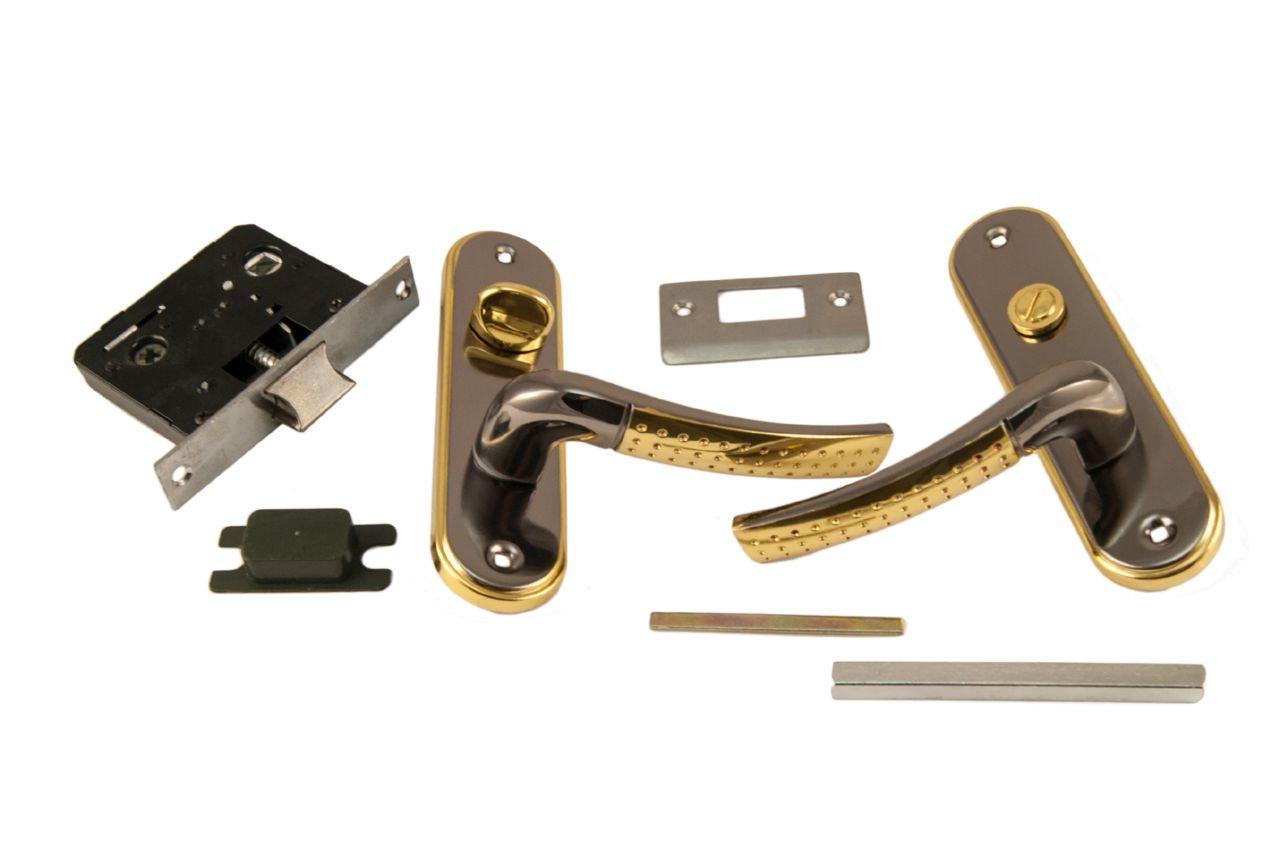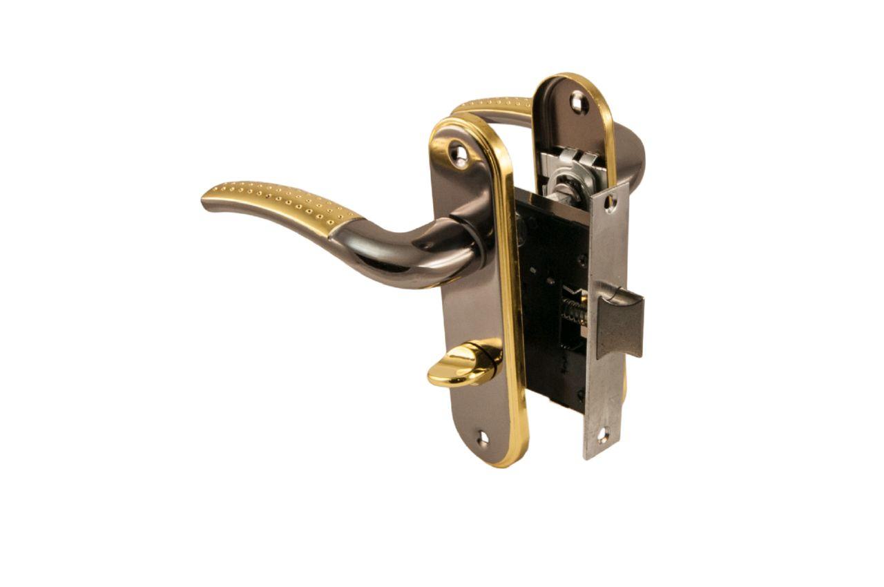 Ручка дверна на планці в комплекті з врізним замком під фіксатор або під циліндр. Матеріал: метал / алюміній.