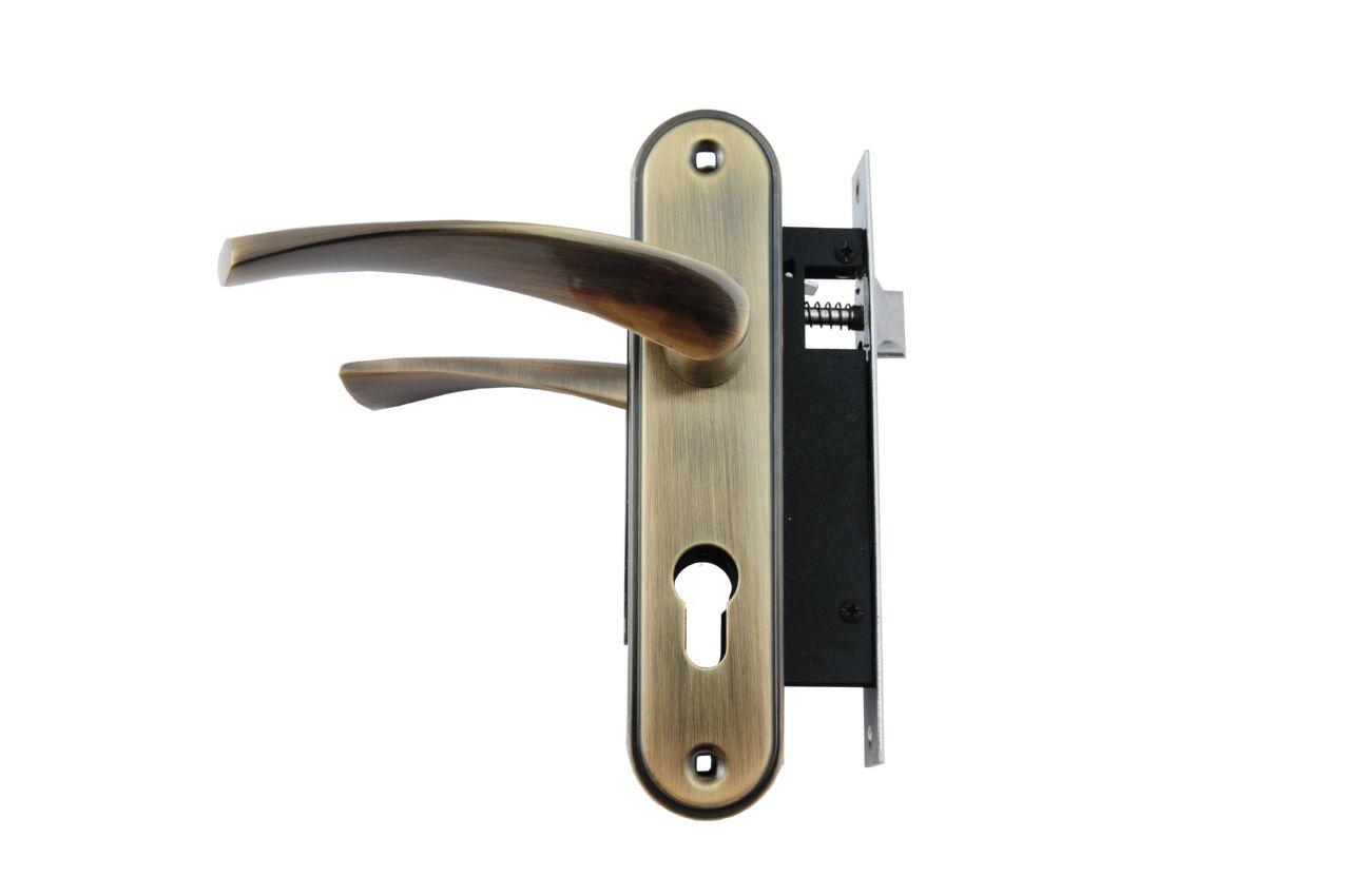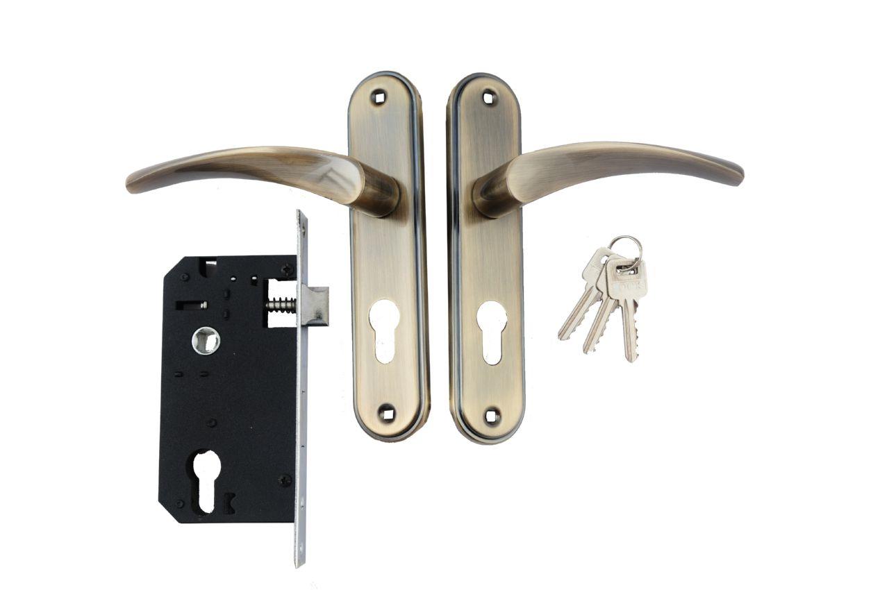 Ручка дверна на планці з корпусом замка і секретом (3 ключа). Ручка - алюміній. Планка - метал. Міжосьова відстань - 58мм.
