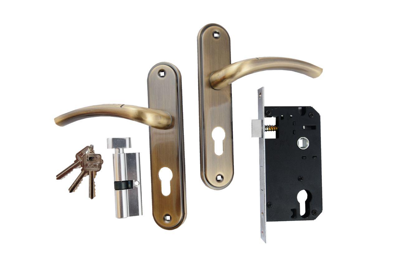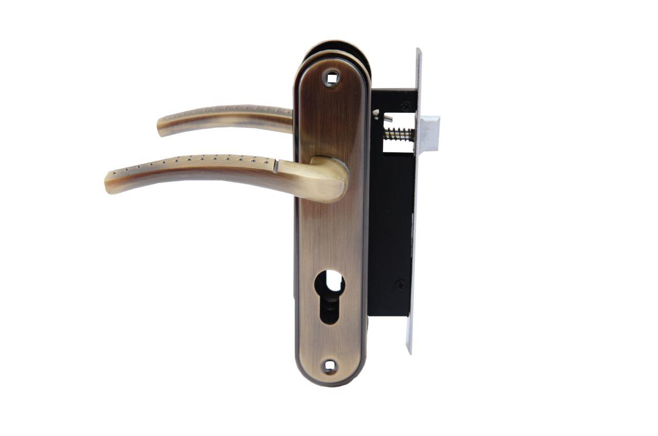 Дверна ручка на планці у комплекті з врізним замком, циліндром та трьома ключами. Ручка виготовлена з алюмінію, планка – з міцного металу, що забезпечує довговічність та надійність у використанні. Міжосьова відстань – 58 мм. Покриття у відтінку бронза (AB) додає виробу класичного вигляду та стійкості до зношування. Підходить для встановлення на міжкімнатні та вхідні двері.