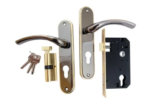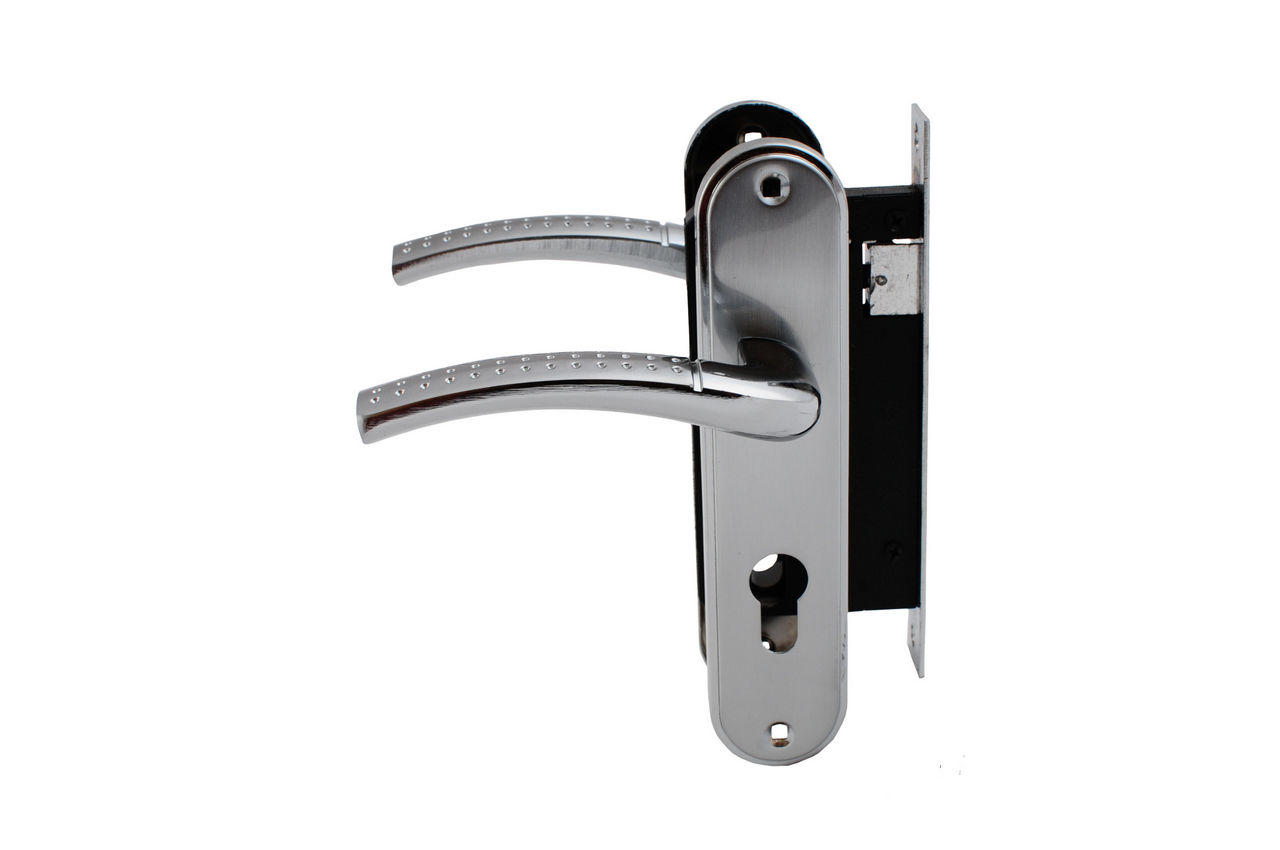 Дверна ручка на планці у комплекті з врізним замком, циліндром та трьома ключами. Ручка виготовлена з алюмінію, планка – з міцного металу, що гарантує надійність та довговічність. Міжосьова відстань – 58 мм. Комбіноване покриття сатин/хром (SN/CP) надає виробу стильного та сучасного вигляду, а також забезпечує стійкість до подряпин і зношування. Підходить для встановлення на міжкімнатні та вхідні двері.