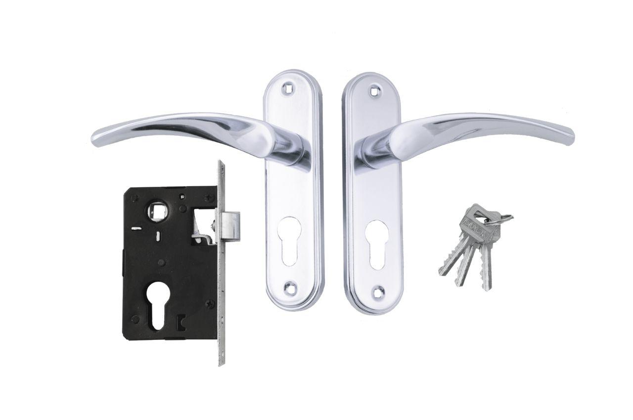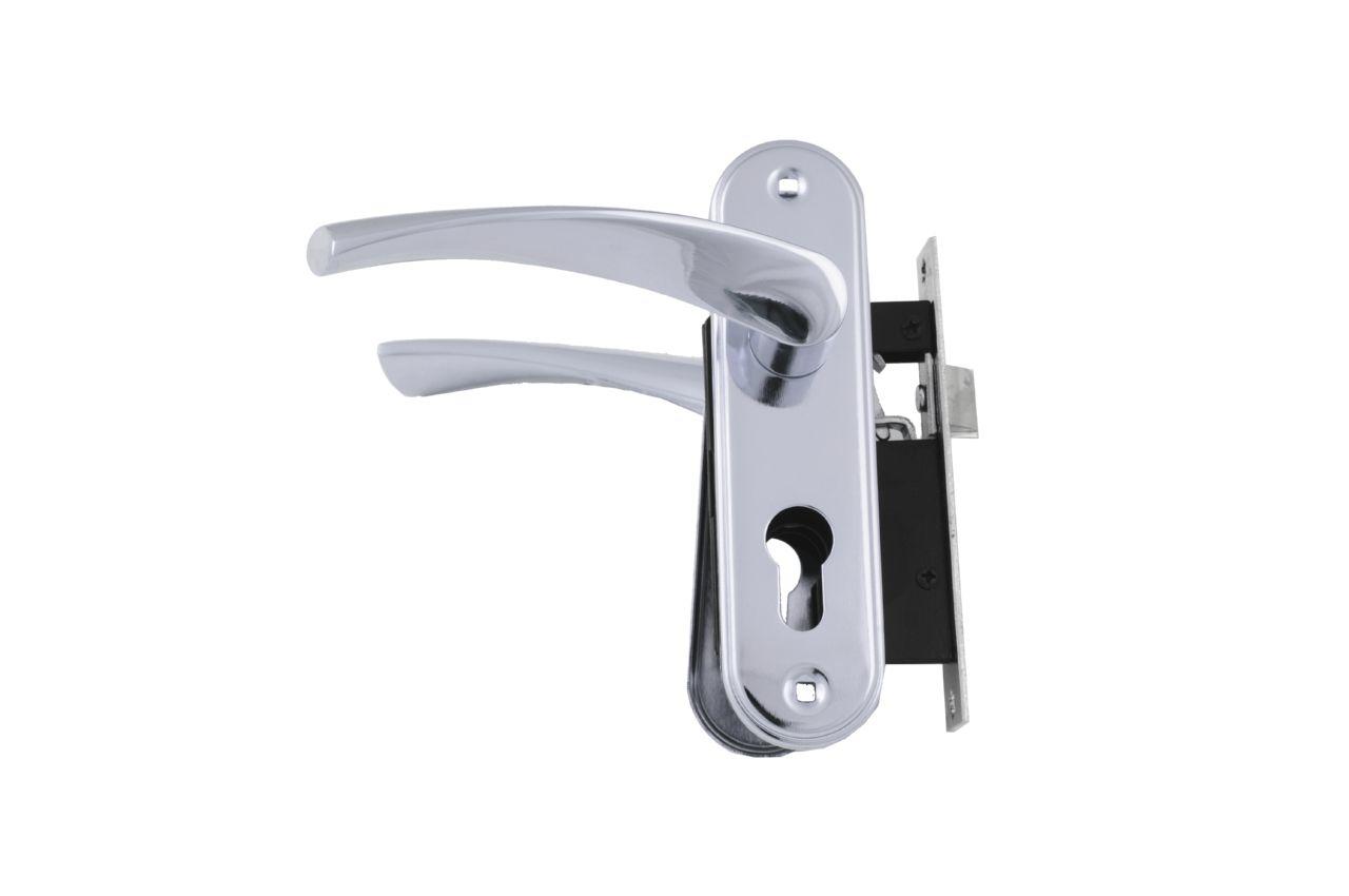 Дверна ручка на планці з корпусом у комплекті з врізним замком під циліндр. Виготовлена з комбінації міцного металу (планка) та алюмінію (ручка), що забезпечує довговічність і стійкість до зношення. Хромоване покриття (CP) має дзеркальний блиск і додає дверям сучасного, елегантного вигляду. Підійде для встановлення на міжкімнатні або вхідні двері.