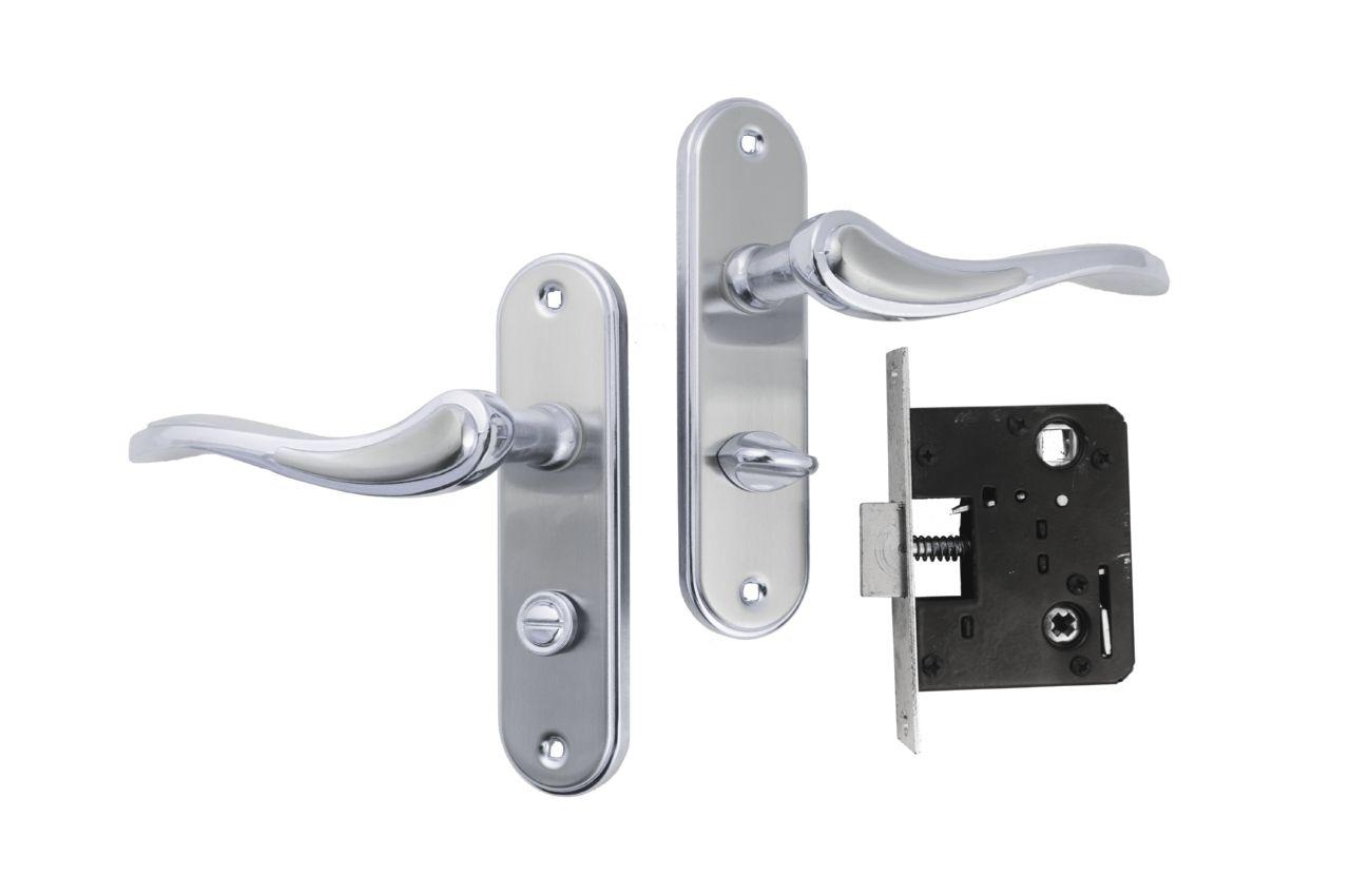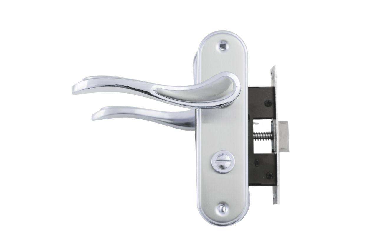Ручка дверна на планці в комплекті з врізним замком під фіксатор. Матеріал: метал-планка / алюміній-ручка.