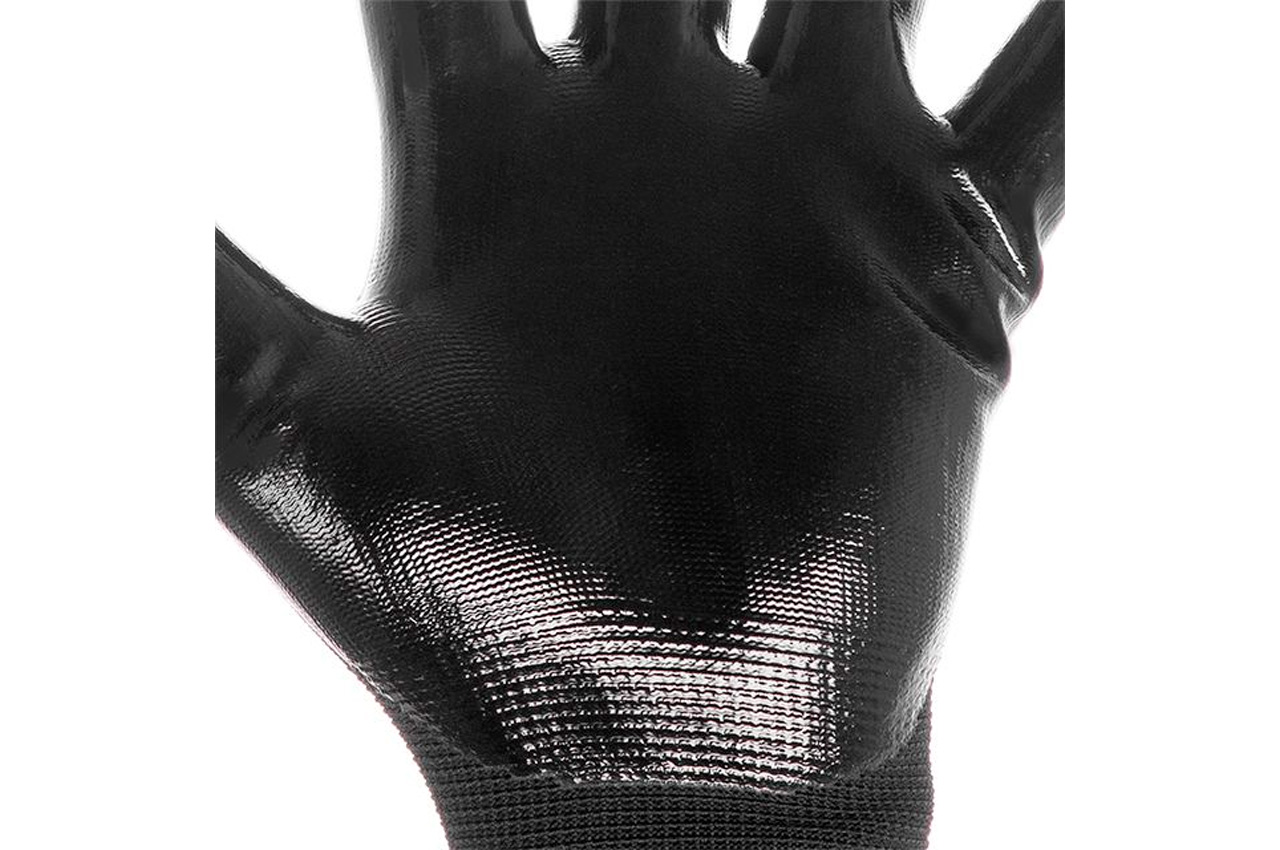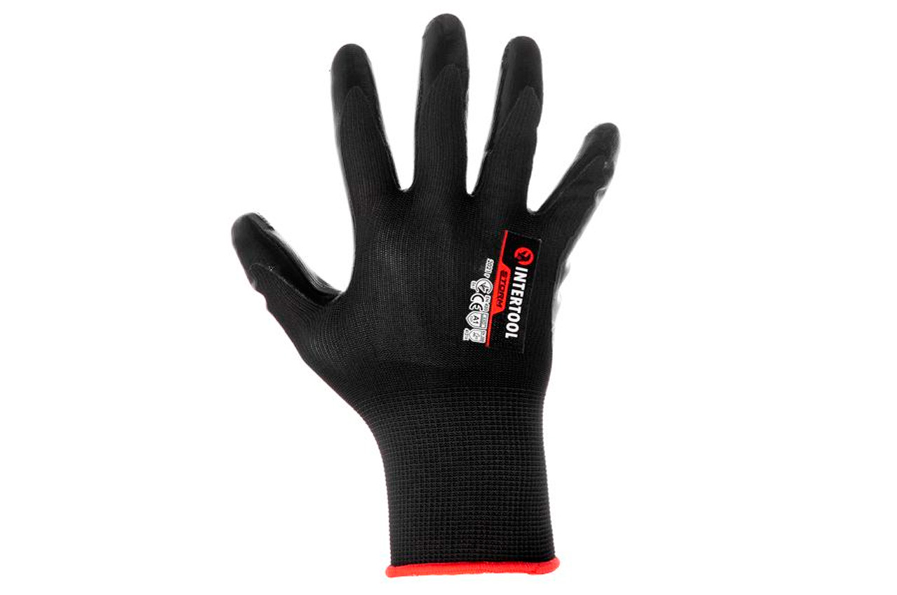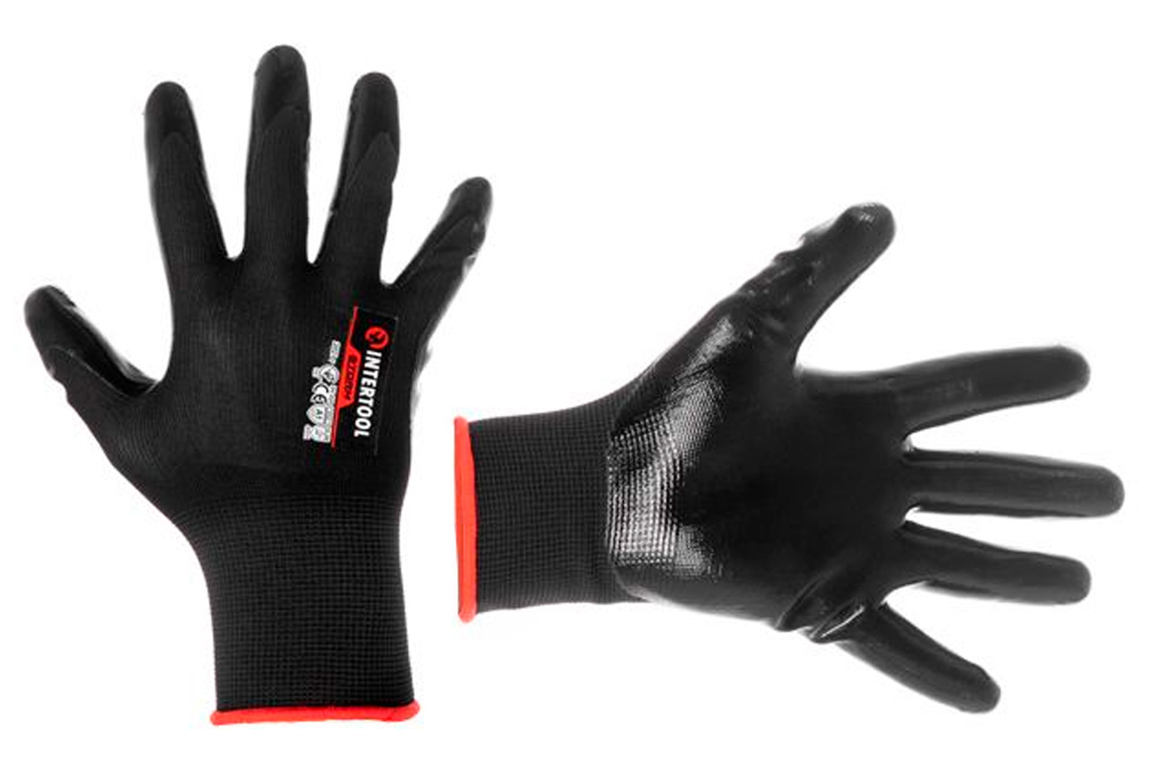 Рукавички INTERTOOL SP-0186 призначені для побутових, будівельних та садових робіт. Забезпечують надійний захист рук від механічних пошкоджень та забруднень під час роботи. Виготовлені рукавички із синтетичного тонкого волокна та зв'язані безшовним методом. Покриття на долоні – чорний нітрил для стійкішого захисту рук від забруднень та механічних пошкоджень.