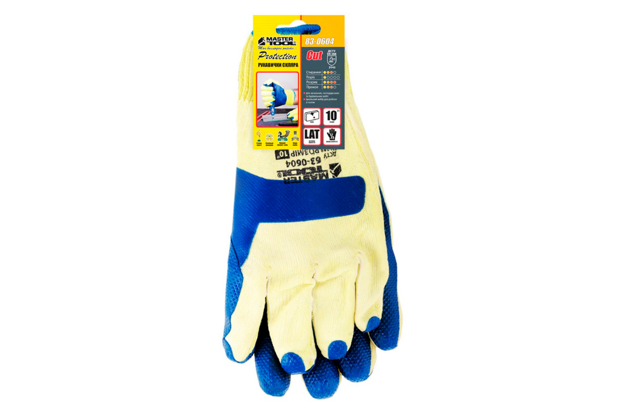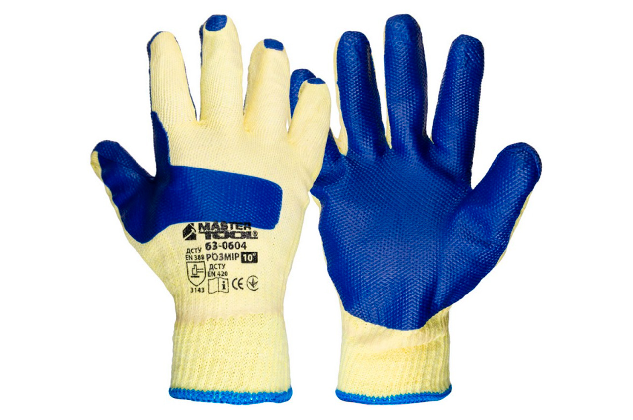 Рукавичка Mastertool - скляна латексна посилена 105 г 10" (жовто-синя)