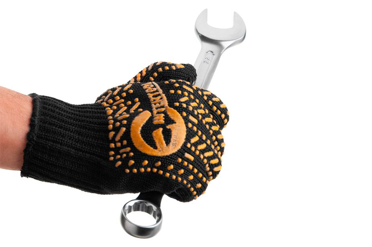 Рукавички бавовняні SP-0136 трикотажні чорного кольору. На долоні нанесено ПВХ-покриття, що забезпечує захист рук та надійне захоплення предметів. З еластичними манжетами, що м'яко прилягають до кисті і запобігають попаданню побутового та будівельного сміття всередину рукавичок. Завдяки х/б основі забезпечується вільний повітрообмін. Призначені для виконання будівельних та сільськогосподарських робіт, ручних механозбірних робіт. Розмір: 10"; В'язка: 10 петель на 1", безшовна; Манжет: в'язаний з окантовкою; Покриття: ПВХ точки на долоні