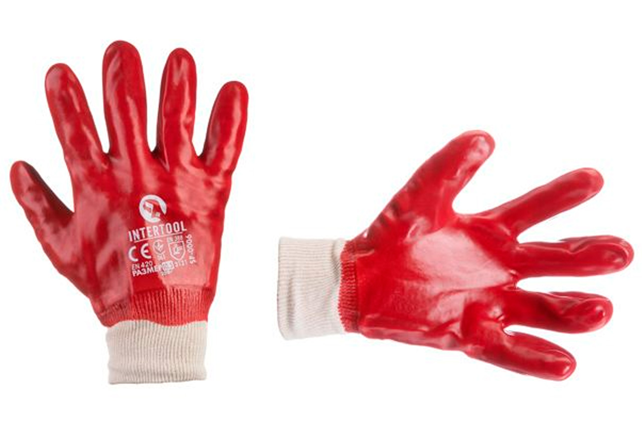 Рукавички SP-0006 на трикотажній основі. Повністю покриті високоякісним ПВХ червоного кольору, що забезпечує еластичність і стійкість рукавичок до впливу масел і нафтопродуктів, в тому числі і сирої нафти. Призначені для високих истирающих навантажень, важких робіт. Кількість в упаковці: 120 пар; Покриття: ПВХ