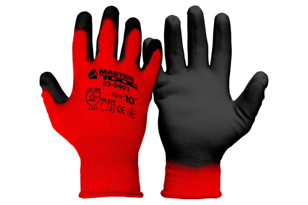 Рукавички трикотажні безшовні з нітрилові покриттям долоні (червоно-чорні). Тканина: поліестер, 13 клас в'язки (13 петель на 1 дюйм). Висока стійкість до розривів та проколів, еластичні навіть при низьких температурах. Застосовуються в домашньому господарстві, саду та майстерень. Підходять для захисту від впливу різних масел, мастил і розчинників.