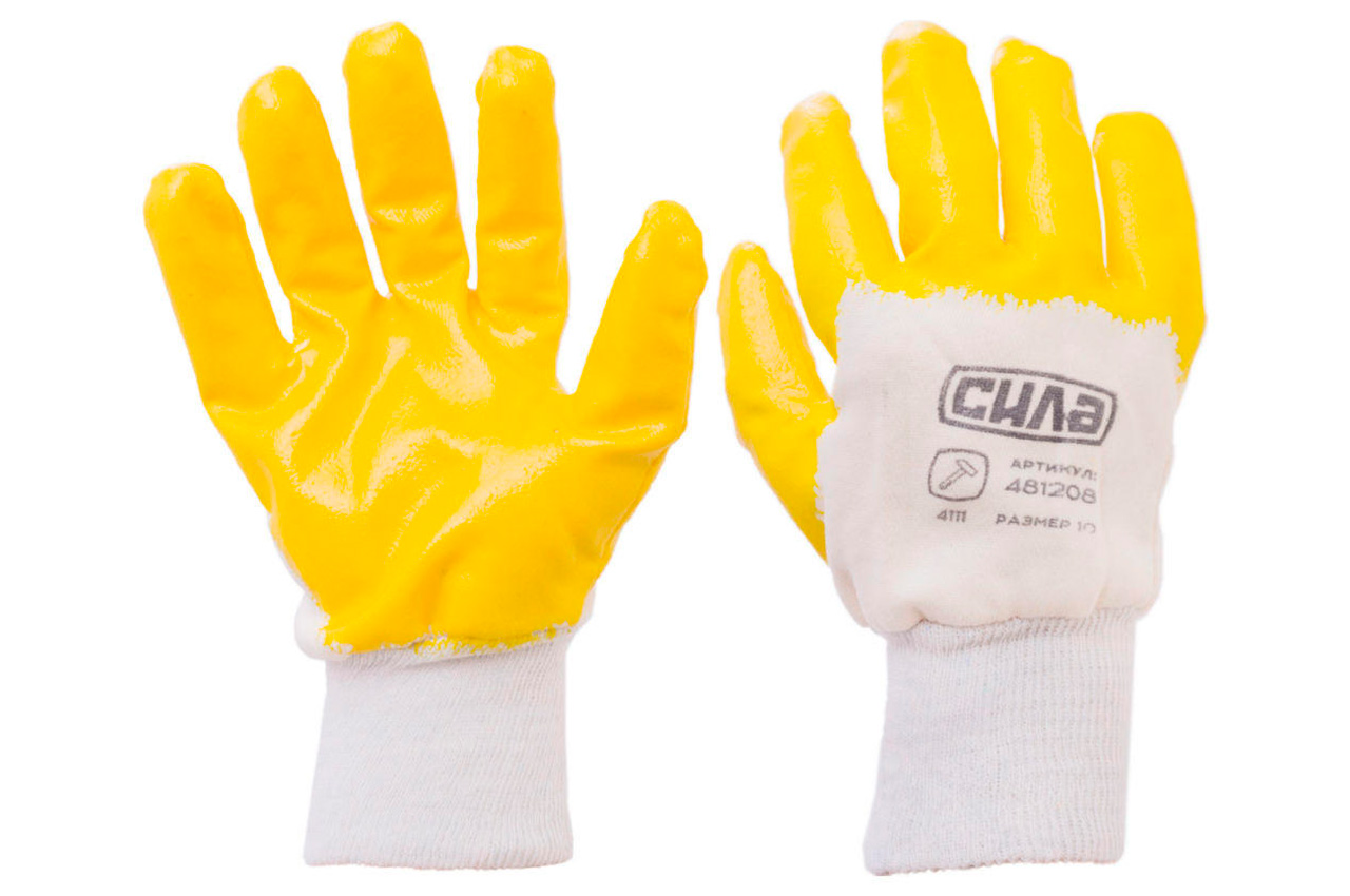 Рукавички Сила виготовлені на основі х / б трикотажу і пов'язані безшовним методом. Покриті жовтим нітрилом на внутрішній і тильній стороні долоні, що забезпечує більш стійку і надійний захист долонь і пальців від забруднень і пошкоджень при проведенні побутових, будівельних і садових робіт. Стійкі до стирання і мають довгий термін експлуатації. Повітропроникна тканинна основа створює додатковий комфорт.
