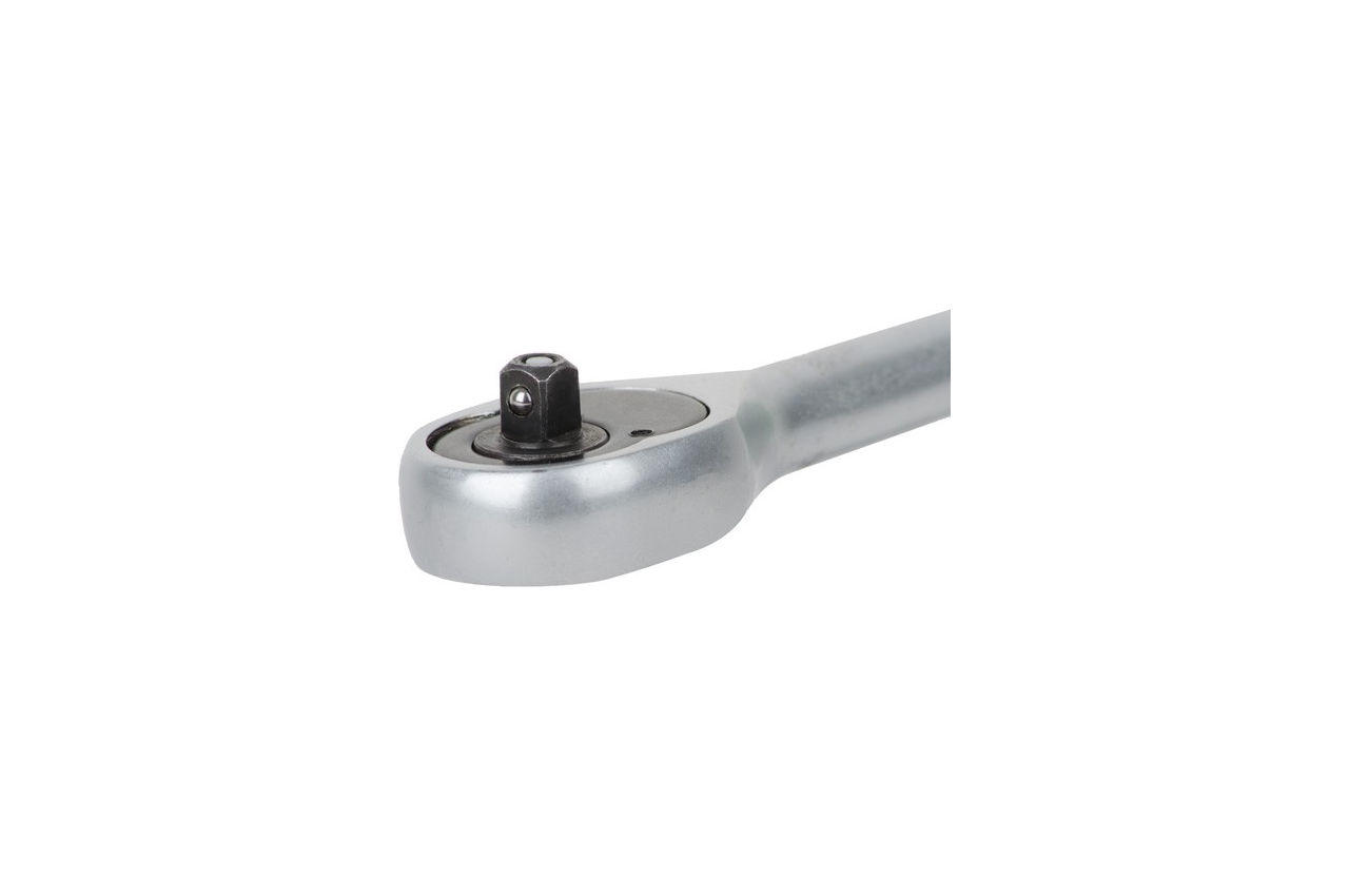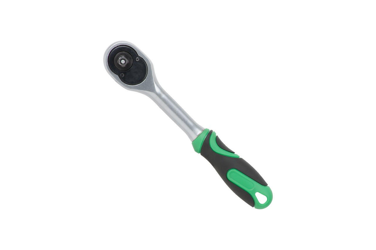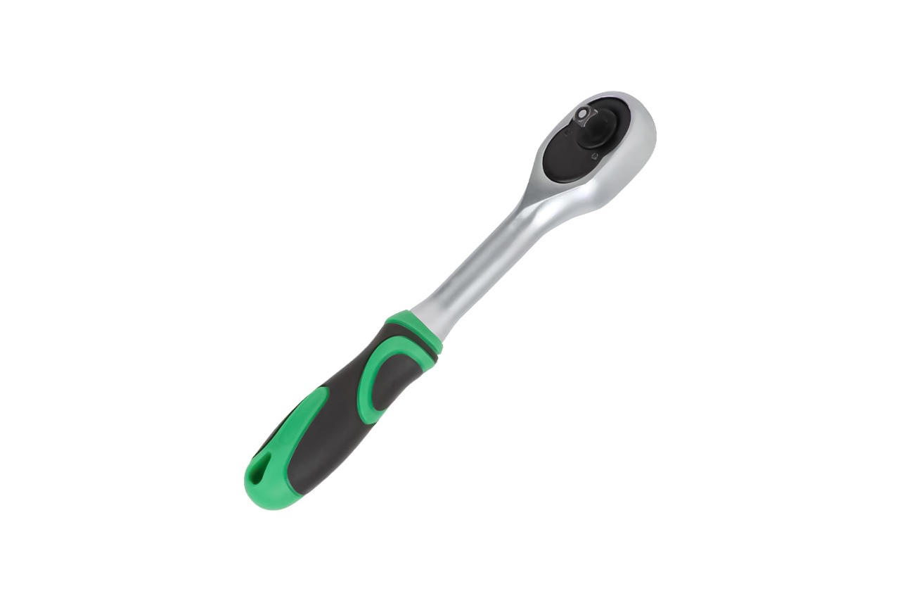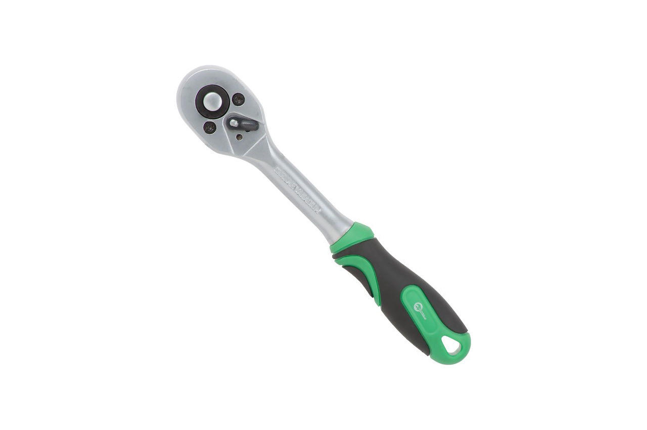 Тріскачка виготовлена із загартованої сталі з додаванням Cr-V. Витримує критичні навантаження і не схильна до появи корозії. Храповий механізм в 72 зуба з дрібним кроком забезпечить плавний хід і дозволить працювати тріскачкою в самих важкодоступних місцях. Тріскачка, з посадковим квадратом 1/4 ", оснащена системою швидкого скидання і фіксації головок. Є перемикач напряму - можна крутити в обидві сторони. Зручна ручка з двокомпонентним покриттям не ковзає навіть в мокрих або брудних руках. Загальна довжина: 165 мм; Квадрат: 1/4 "
