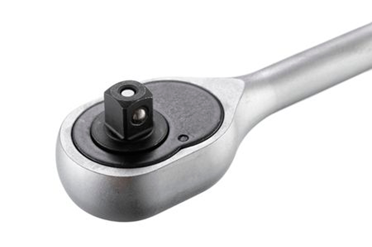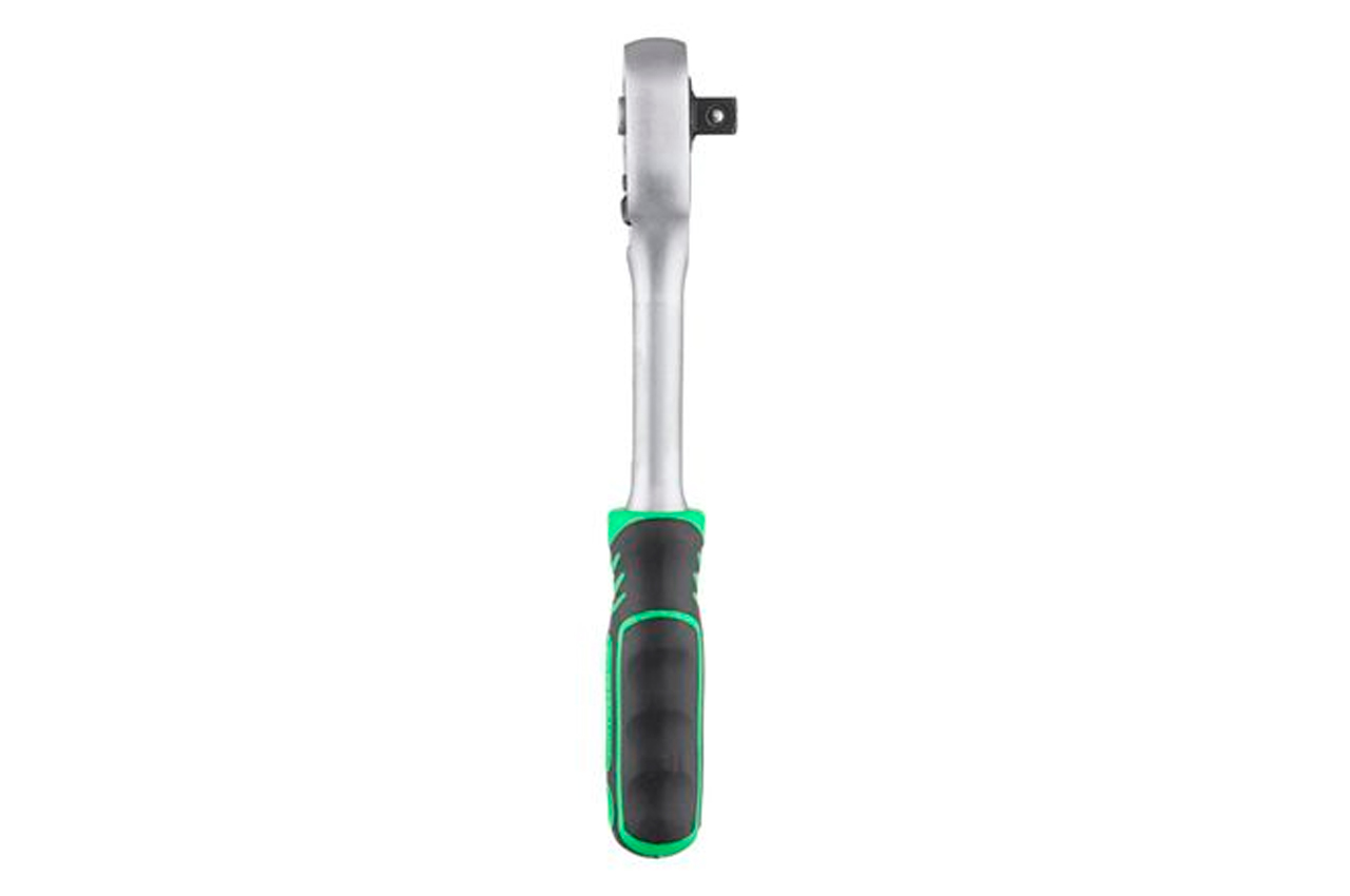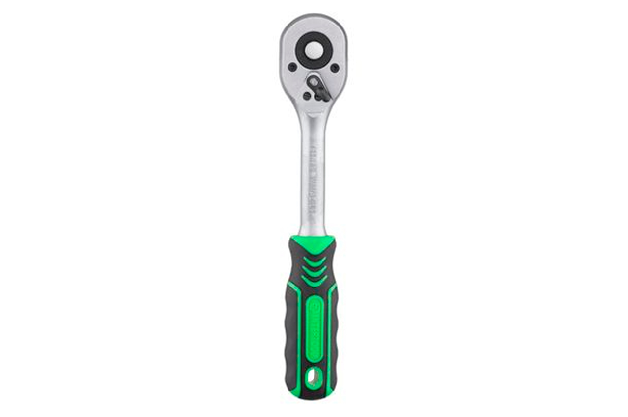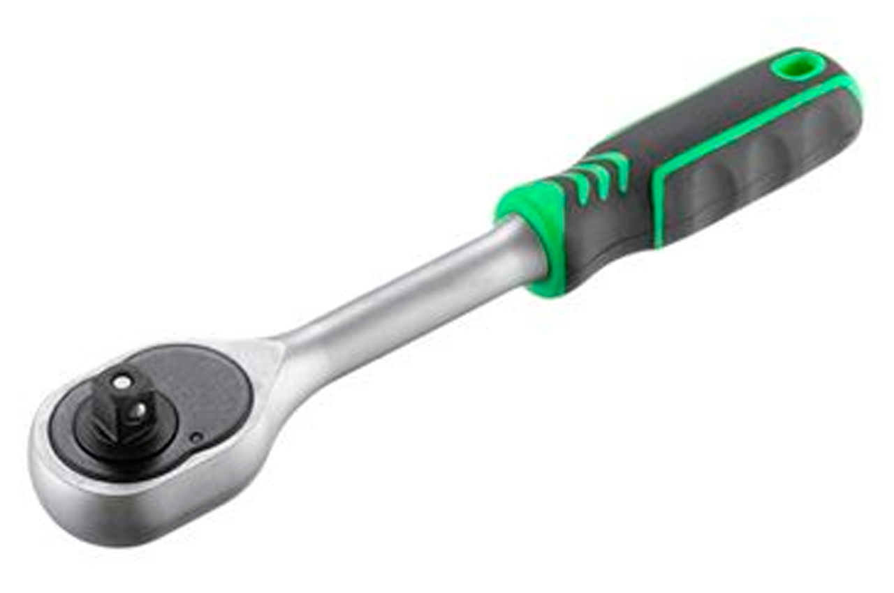 Тріскачка виготовлена із загартованої сталі з додаванням Cr-V. Витримує критичні навантаження і не схильна до появи корозії. Храповий механізм в 72 зуба з дрібним кроком забезпечить плавний хід і дозволить працювати тріскачкою в самих важкодоступних місцях. Тріскачка, з посадковим квадратом 3/8 ", оснащена системою швидкого скидання і фіксації головок. Є перемикач напряму - можна крутити в обидві сторони. Зручна ручка з двокомпонентним покриттям не ковзає навіть в мокрих або брудних руках. Загальна довжина: 215 мм; Квадрат: 3/8 "