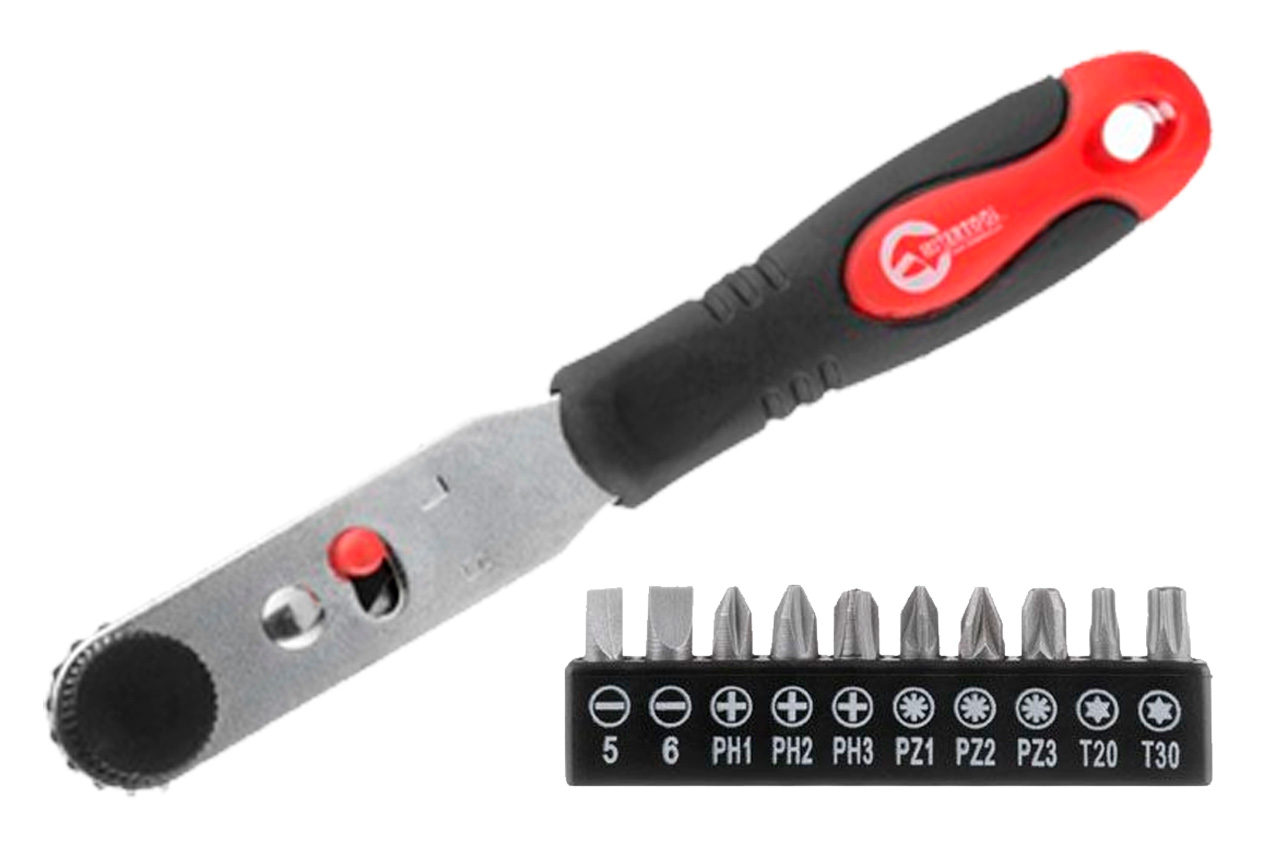 Рукоятка з храповим механізмом для отверточних насадок (біт) з бітами: SL5, SL6, PH1, PH2, PH3, PZ1, PZ2, PZ3, T20 і T30. Кількість в упаковці: 10 од.