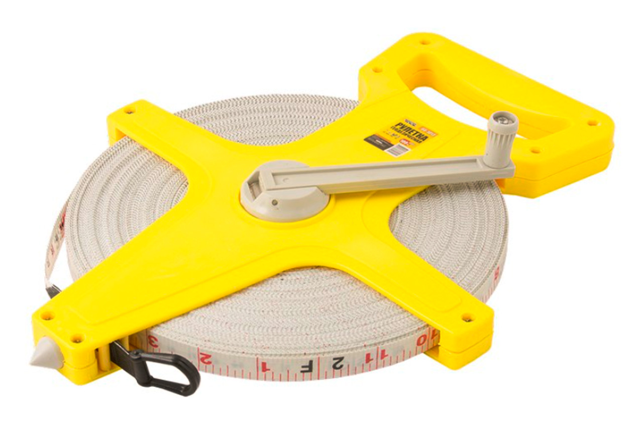 Геодезична рулетка або геодезична мірна стрічка - призначена для вимірювання великих відстаней на відкритій місцевості або в закритих приміщеннях. Незамінна річ під час будівництва за її допомогою проводять попередні розрахунки, розмітку території тощо. Ширина полотна: 13 мм; Довжина полотна: 100 м