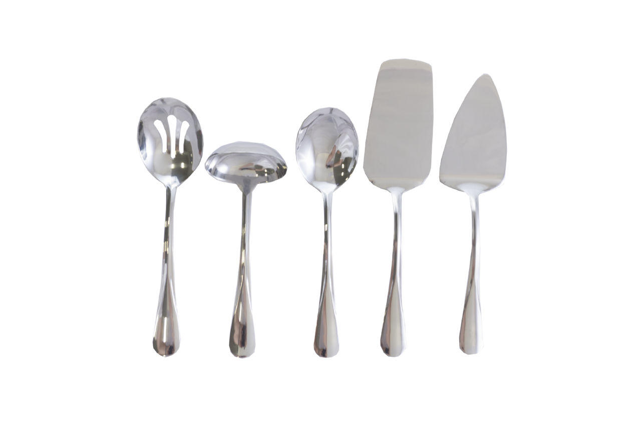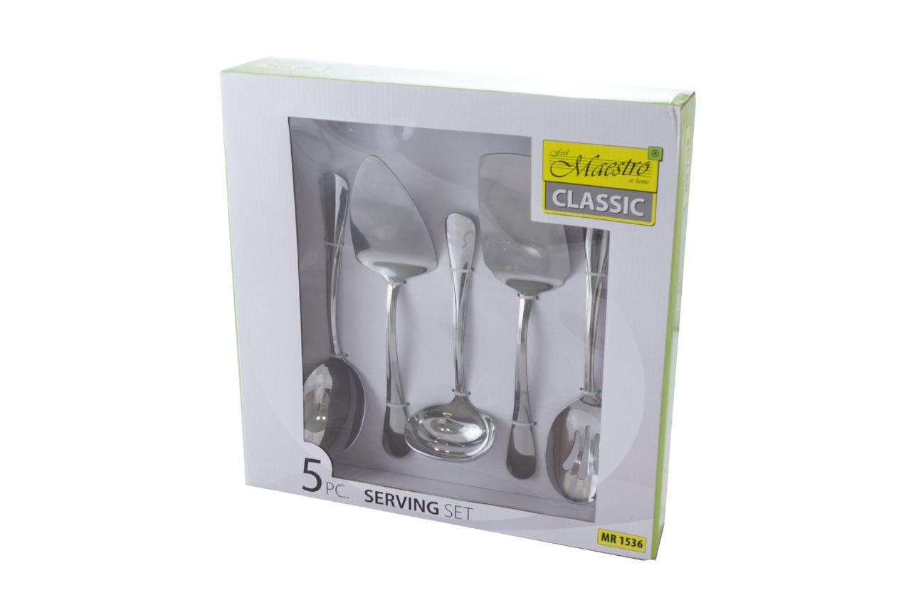 Набір сервіровок Maestro MR 1536 складається з 5 предметів для сервірування столу, виготовлений з високоякісної нержавіючої сталі з дзеркальним поліруванням. Цей набір складається з таких предметів: Лопатка для салатів та лазаньї, Лопатка для пирогів і тістечок, Сервірувальна ложка, Сервірувальна ложка з прорізами, Половник