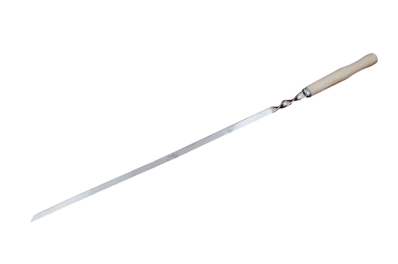 Зручна, дерев'яна ручка гвинт, фіксує шампур на мангалі. Загострений кінець, для зручності.