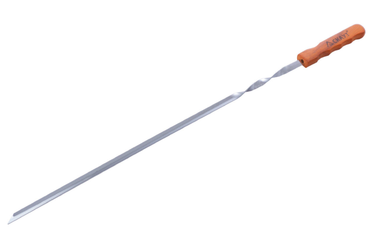Зручна, дерев'яна ручка гвинт, фіксує шампур на мангалі. Загострений кінець, для зручності.