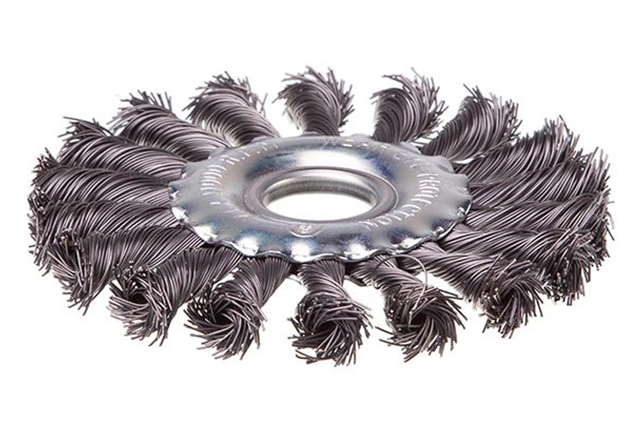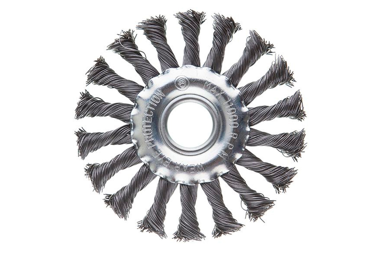 Щітка дискова з плетеними дротом. Призначена для робіт по дереву, бетону, металу і лакофарбовим покриттям. Діаметр щітки 115 мм, посадкового отвору - 22,2 мм. Товщина дроту 0,5 мм. Швидкість обертання: 11000 об / хв. Тип дроту: плетена проволока; Швидкість обертання: 11000 об / хв; Діаметр щітки: 115 мм; Діаметр дроту: 0,5 мм; Діаметр отвору: 22,2 мм; Застосування: для дерева, бетону, металу і лакофарбових покриттів