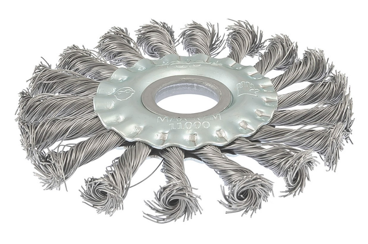 Щітка дискова з плетеними дротом. Призначена для робіт по дереву, бетону, металу і лакофарбовим покриттям. Діаметр щітки 115 мм, посадкового отвору - 22,2 мм. Товщина дроту 0,5 мм. Швидкість обертання: 11000 об/хв.