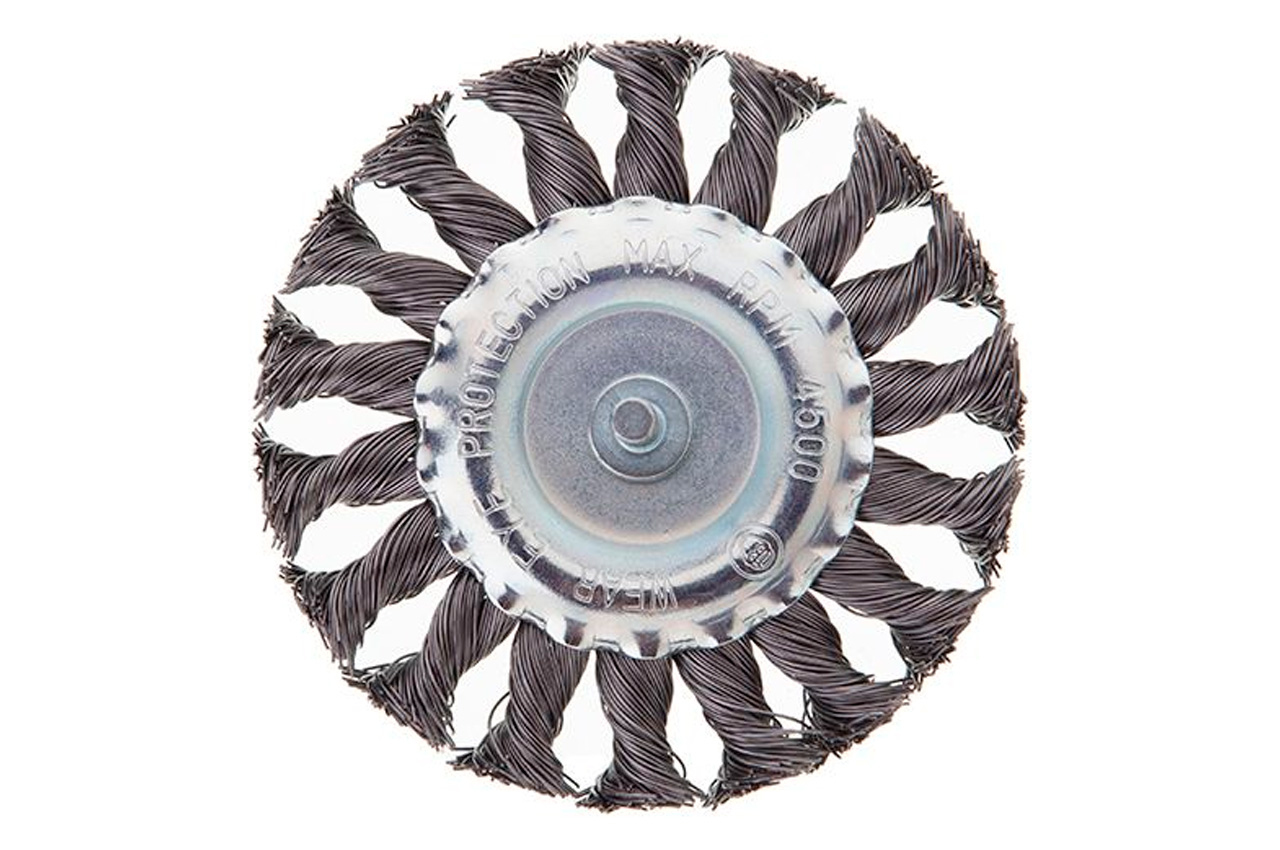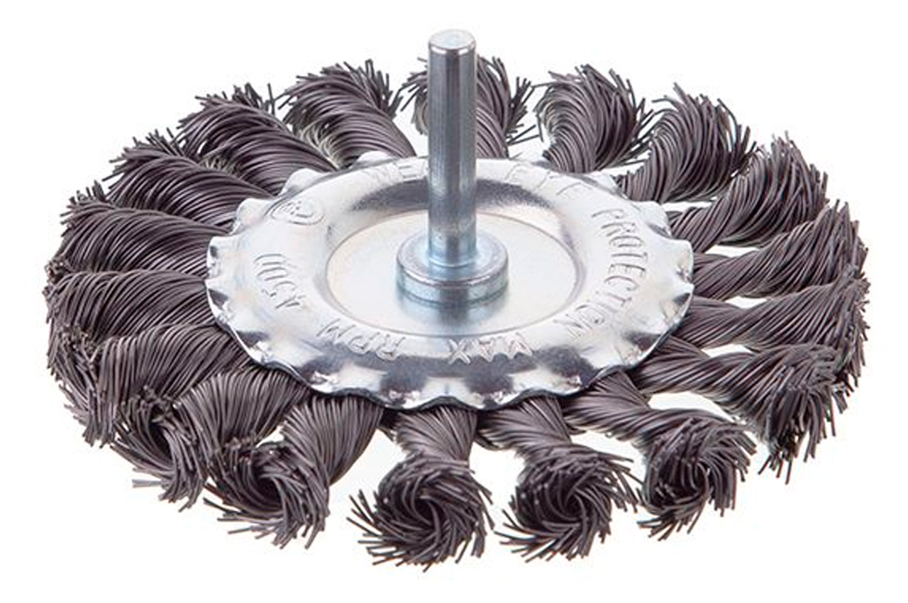 Щітка дискова з плетеними дротом для дрилі. Призначена для робіт по дереву, бетону, металу і лакофарбовим покриттям. Діаметр щітки 100 мм, стрижня - 6 мм. Швидкість обертання: 4500 об / хв Тип дроту: плетена проволока; Діаметр щітки: 100 мм; Швидкість обертання: 4500 об / хв; Діаметр дроту: 0.5 мм; Діаметр стрижня: 6 мм; Застосування: для дерева, бетону, металу і лакофарбових покриттів