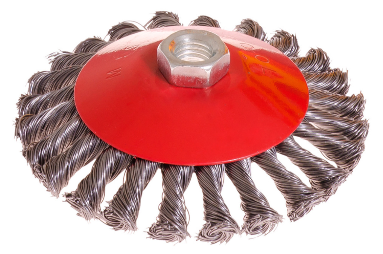 Щітка конусна з плетеними дротом для УШМ. Призначена для робіт по дереву, бетону, металу і лакофарбовим покриттям. Діаметр 125 мм. Товщина дроту 0,5 мм. Швидкість обертання: 6500 об/хв.