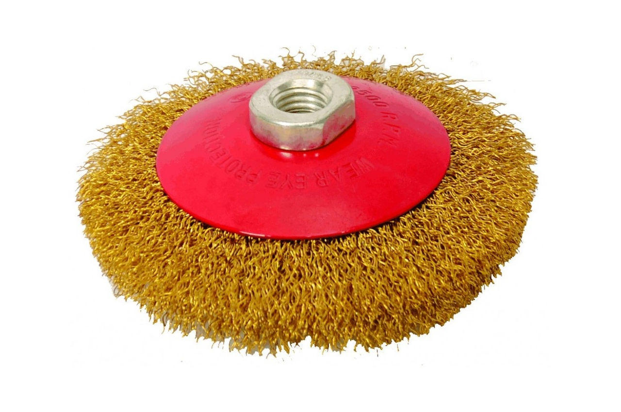 Щітка конусна з рифленою дротом для УШМ. Призначена для робіт по дереву, бетону, металу і лакофарбовим покриттям. Діаметр 125 мм. Товщина дроту 0,3 мм. Швидкість обертання: 6500 об/хв